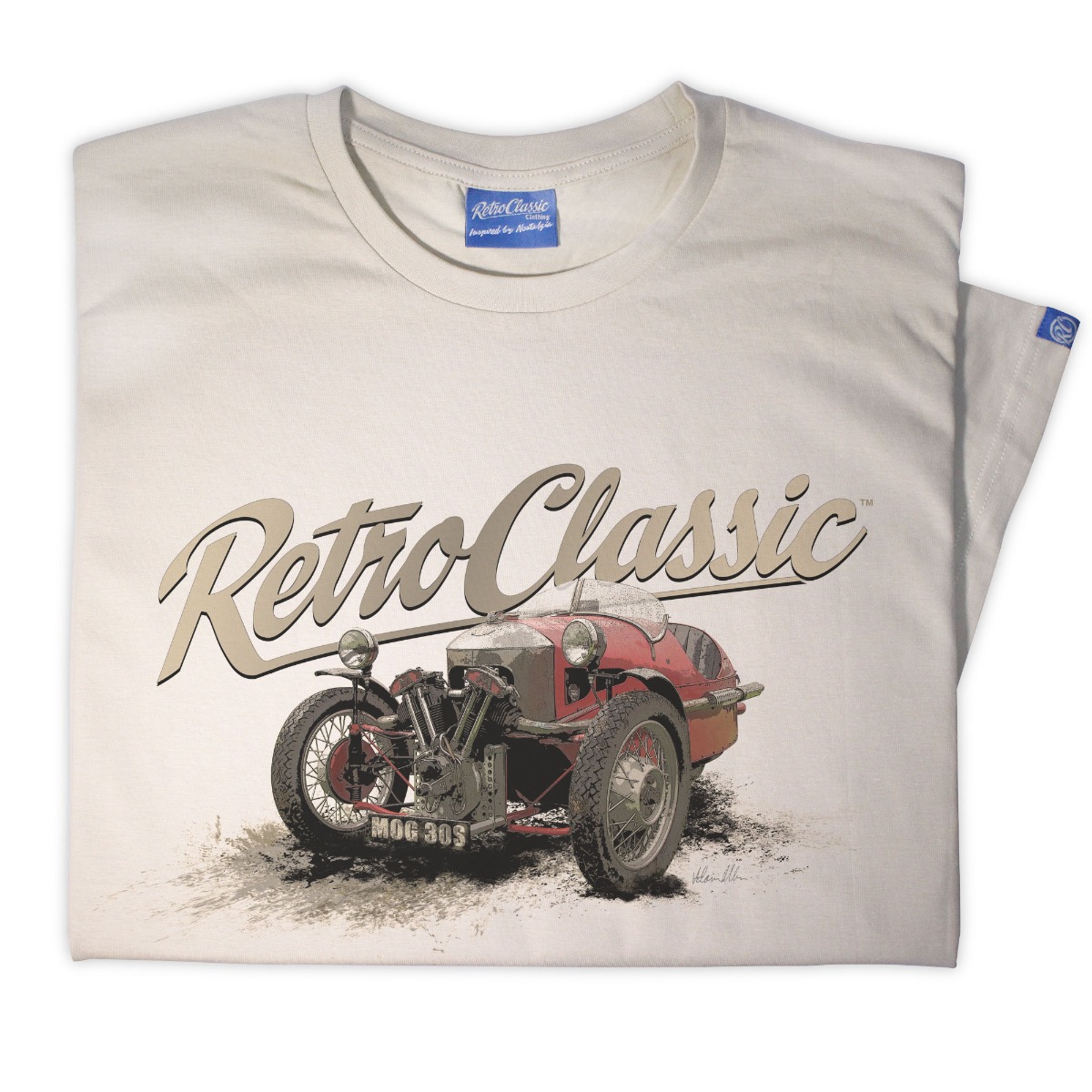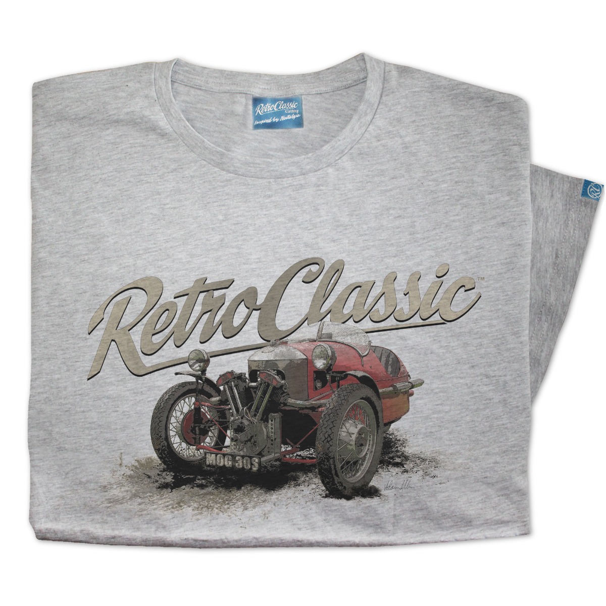 RetroClassicâ„¢ Morgan 3 Wheeler T-shirt featuring a 1930s vintage British car design. Premium cotton retro motoring tee for classic car and Morgan enthusiasts.