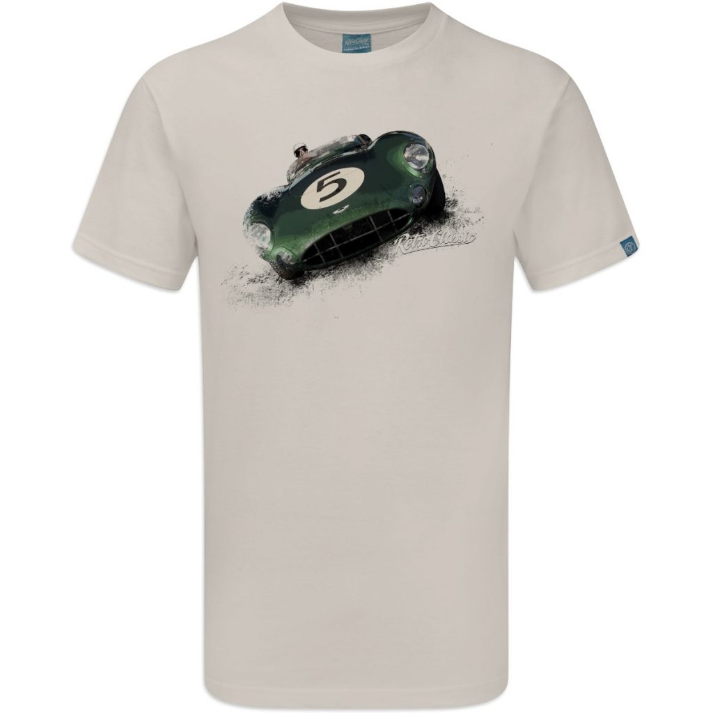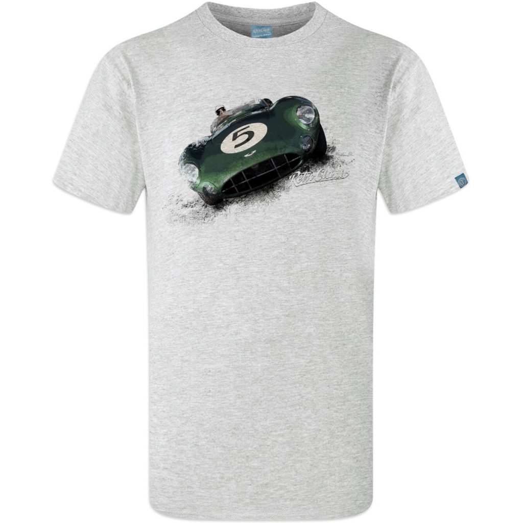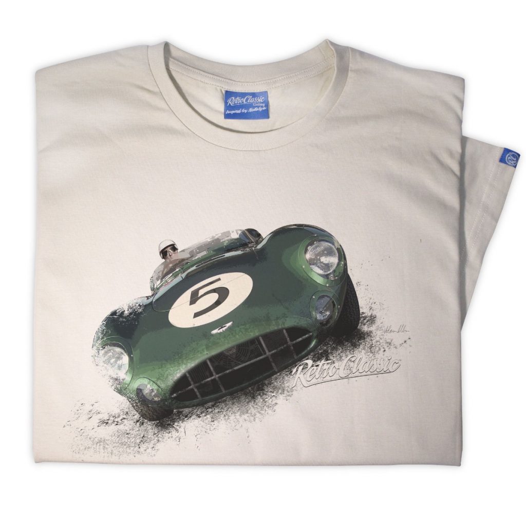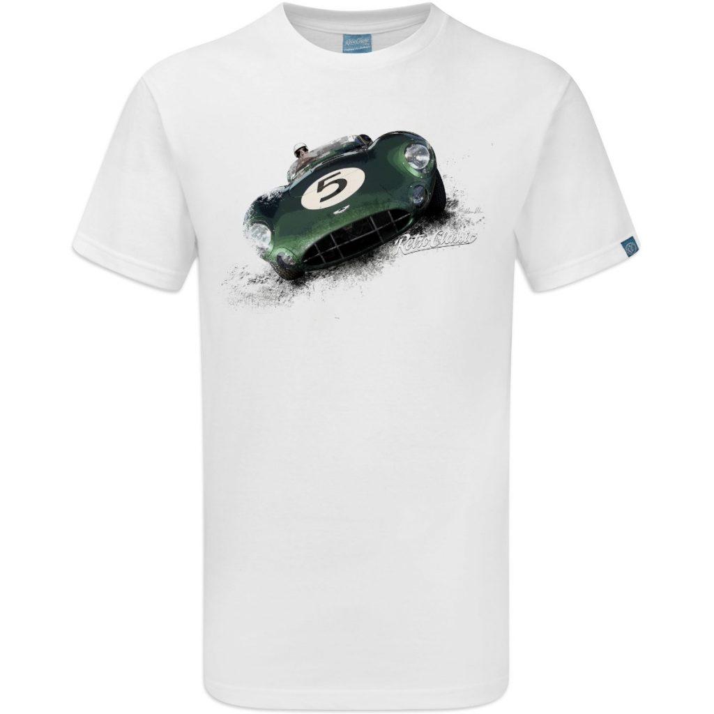 RetroClassic™ Aston Martin DBR1 T-shirt celebrating 1950s motorsport legends. 100% cotton, iconic Le Mans and Nürburgring victories, perfect for car enthusiasts.