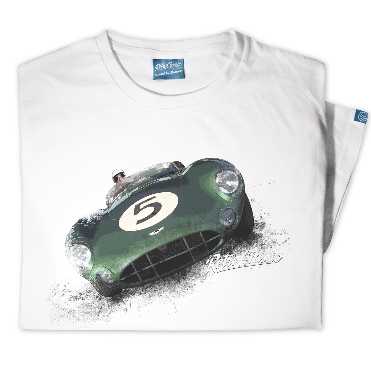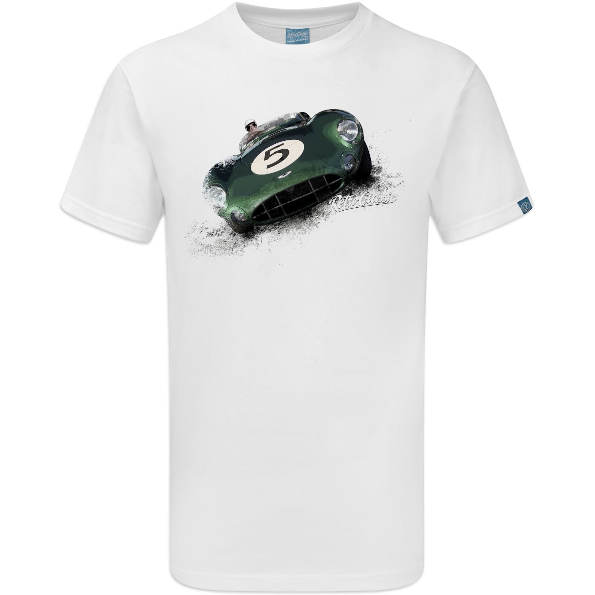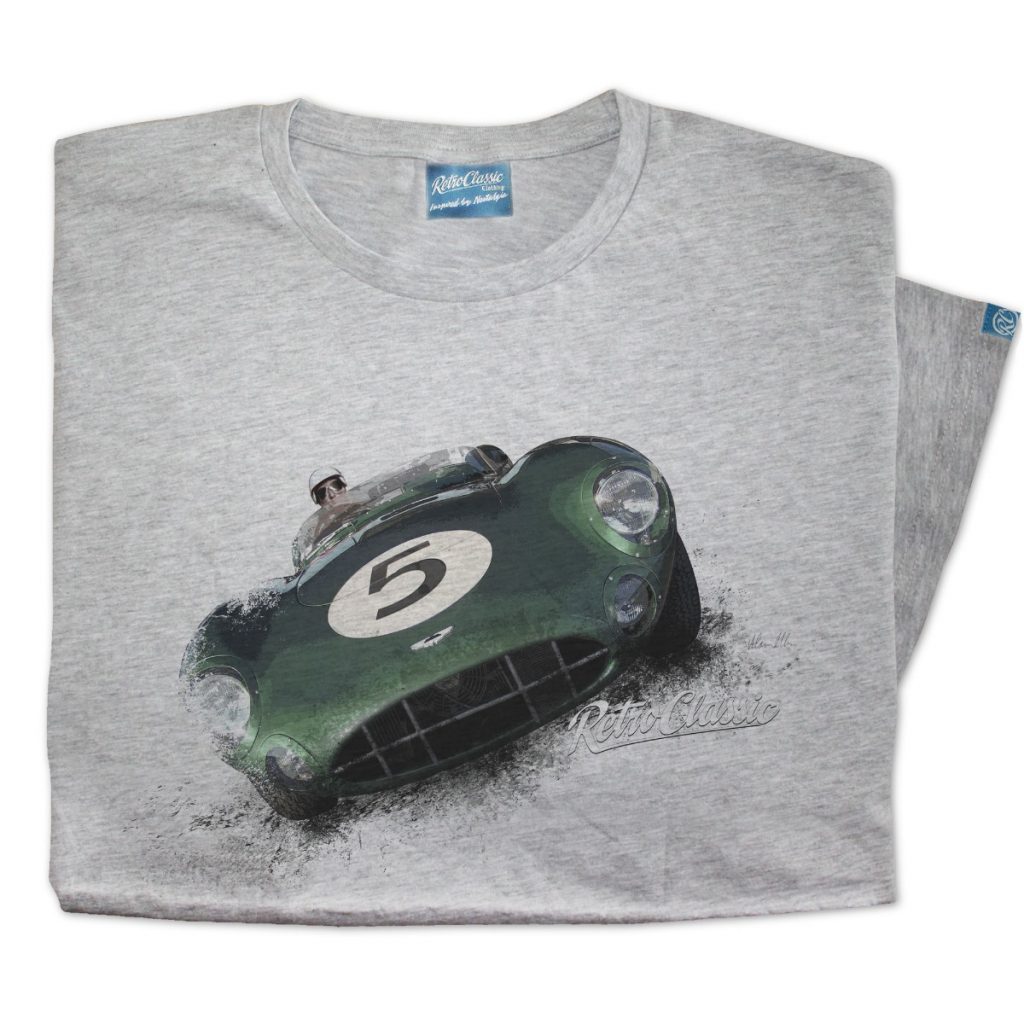 RetroClassic™ Aston Martin DBR1 T-shirt celebrating 1950s motorsport legends. 100% cotton, iconic Le Mans and Nürburgring victories, perfect for car enthusiasts.