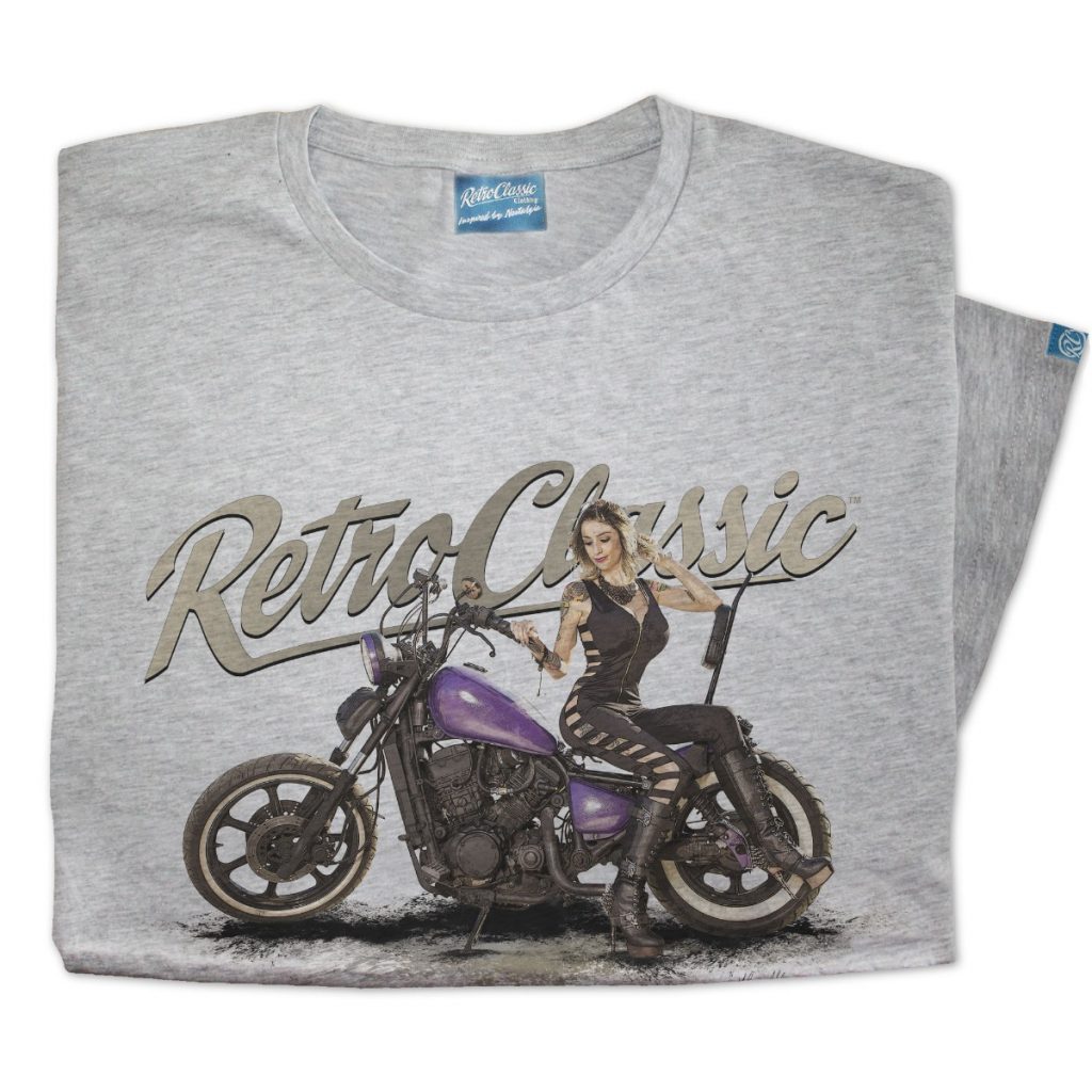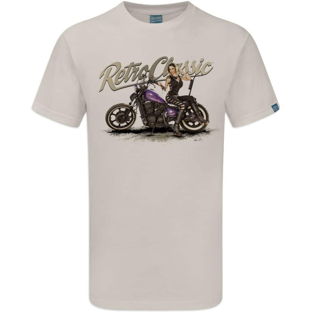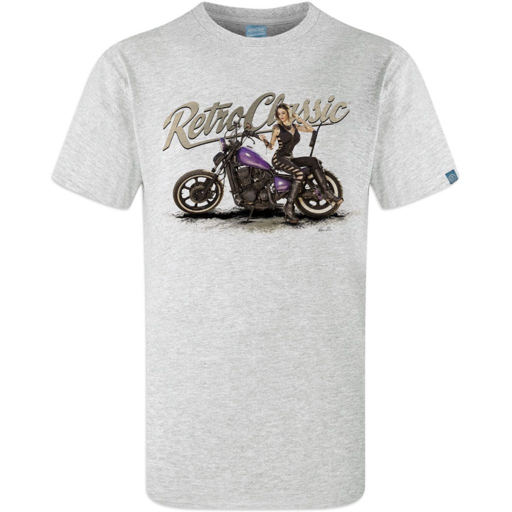 RetroClassicâ„¢ Dee Macias Custom Purple Bobber Harley T-shirt featuring gritty pin-up biker artwork. 100% cotton crew neck in White, Sand & Heather Grey.