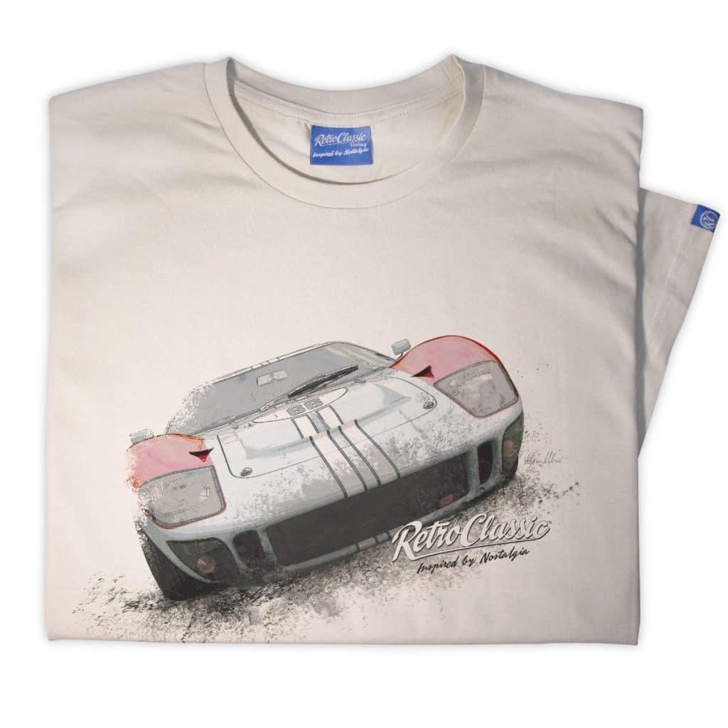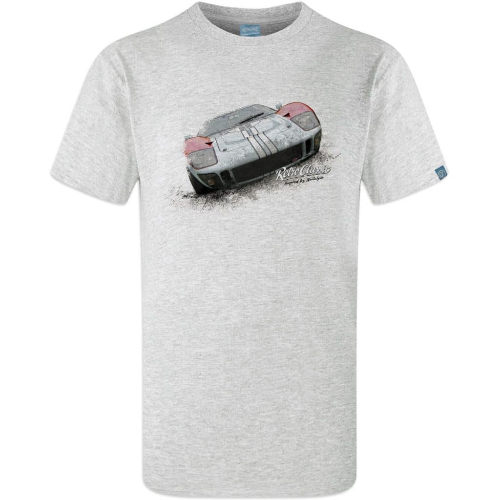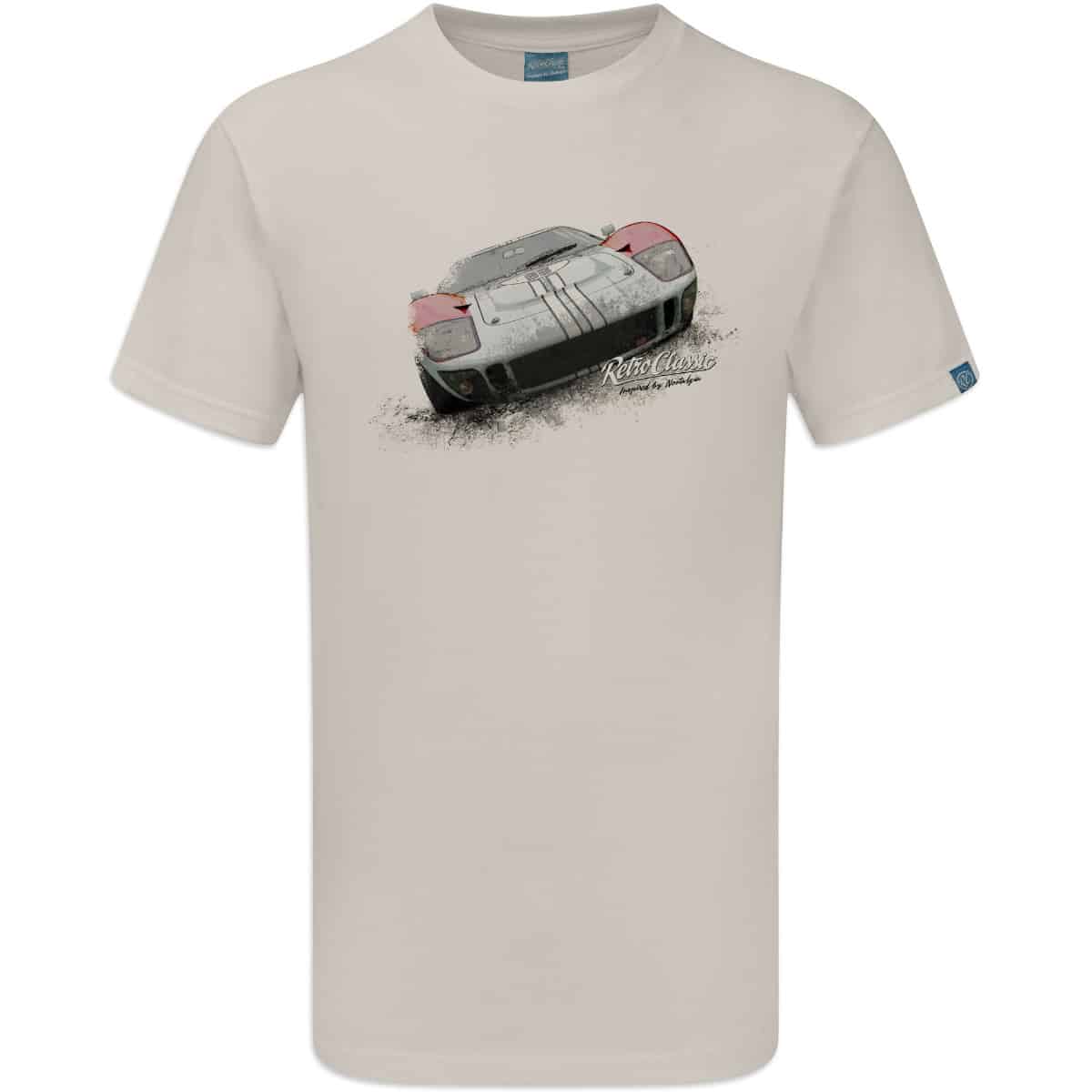 RetroClassic™ Ford GT40 T-Shirt inspired by Le Mans ’66. 100% cotton classic endurance race car tee in White, Sand & Heather Grey.