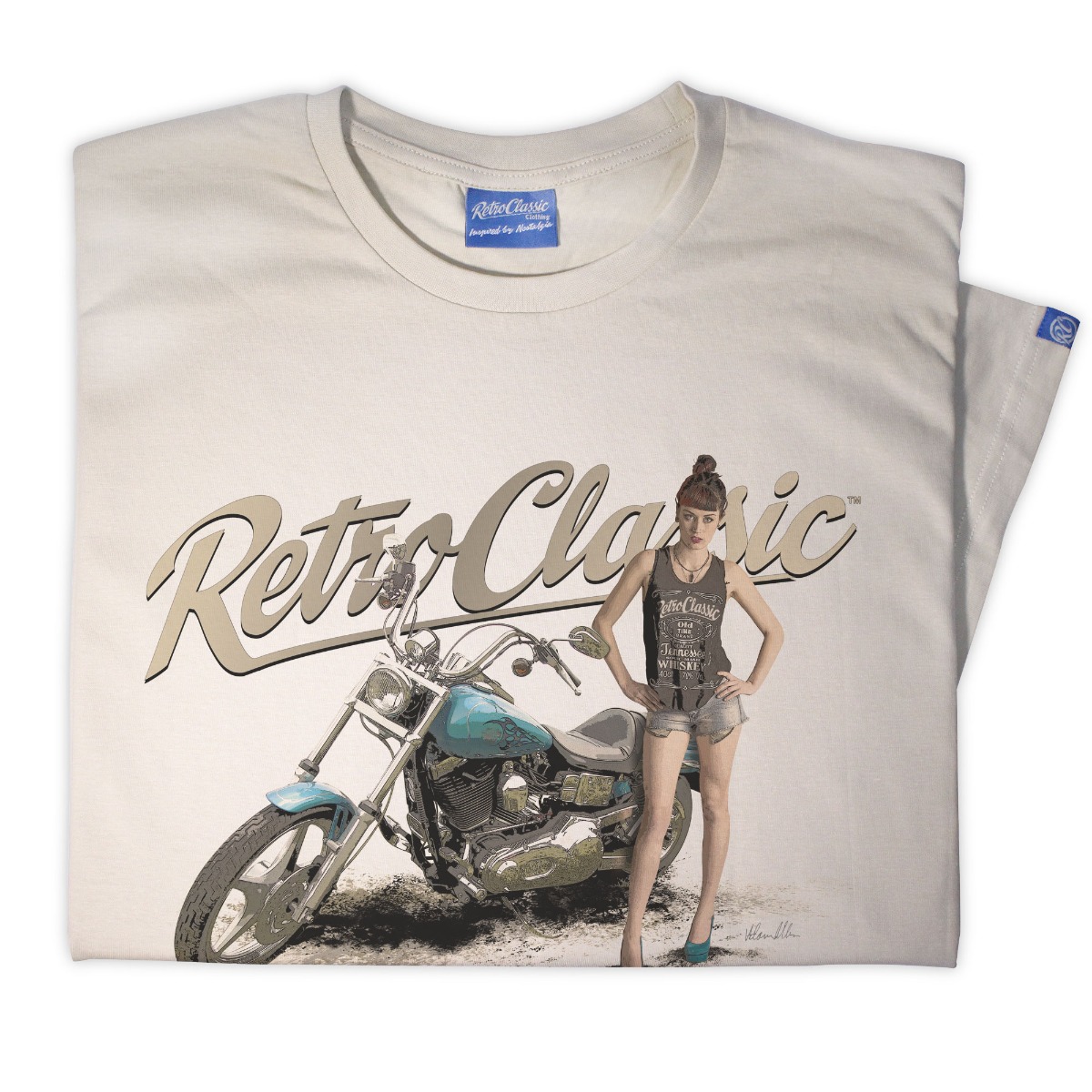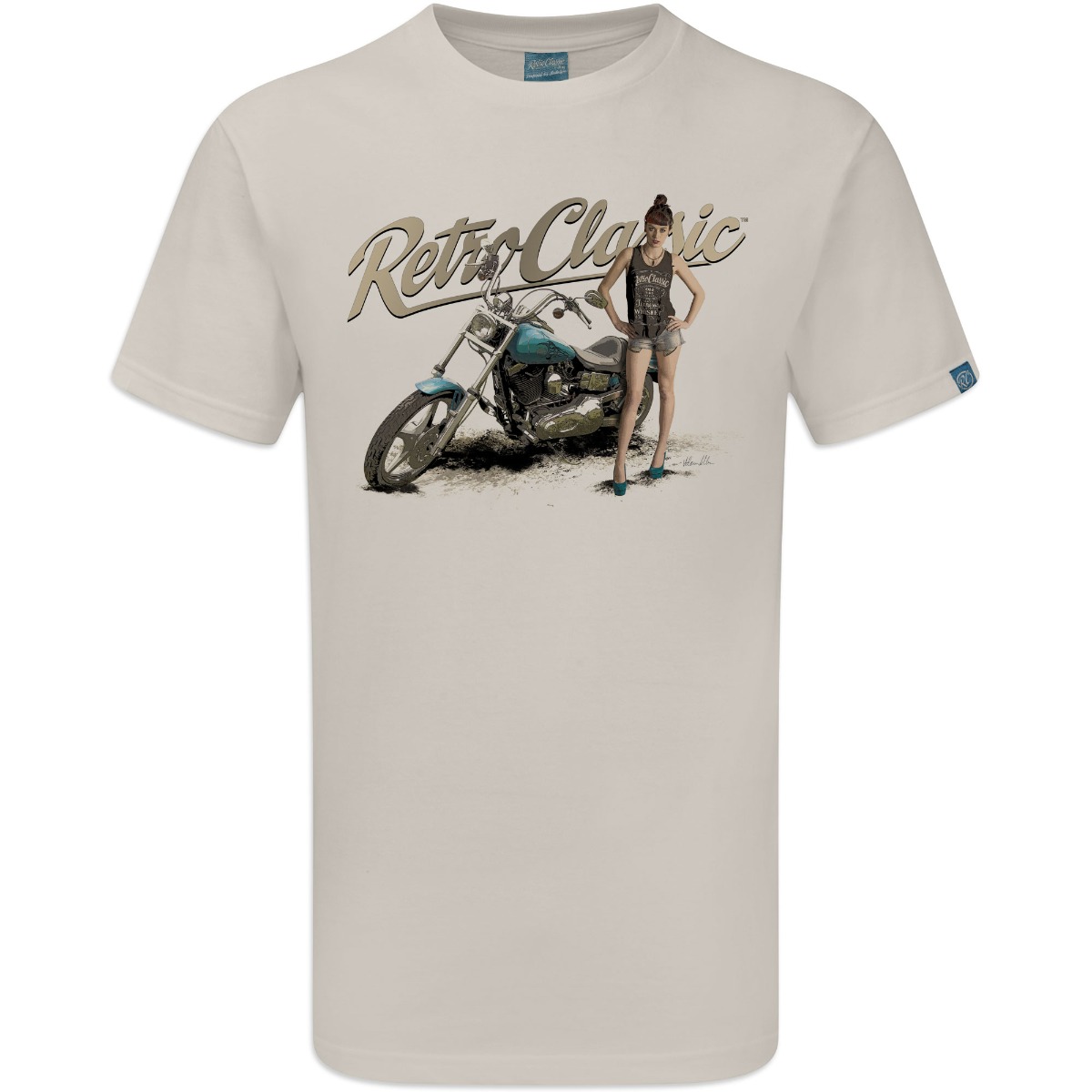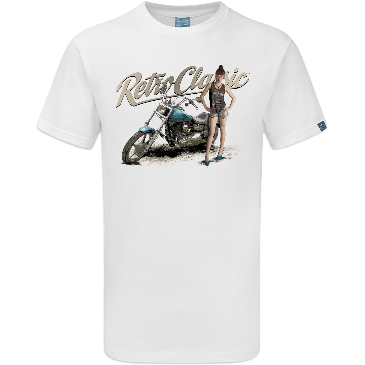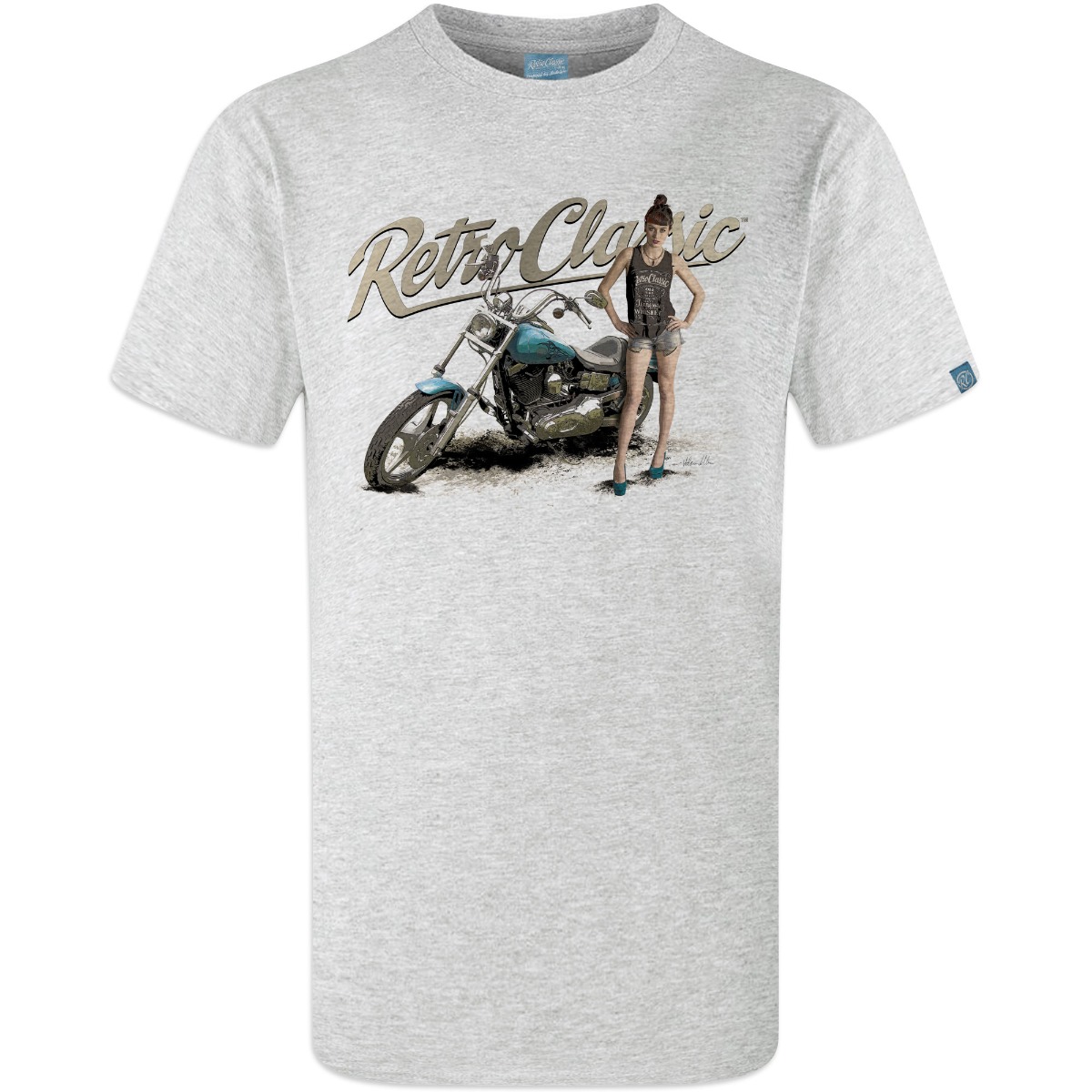 RetroClassic„ Mens Crew Neck T-Shirt with a Classic Harley styled Motorcycle and model FreyaaRay