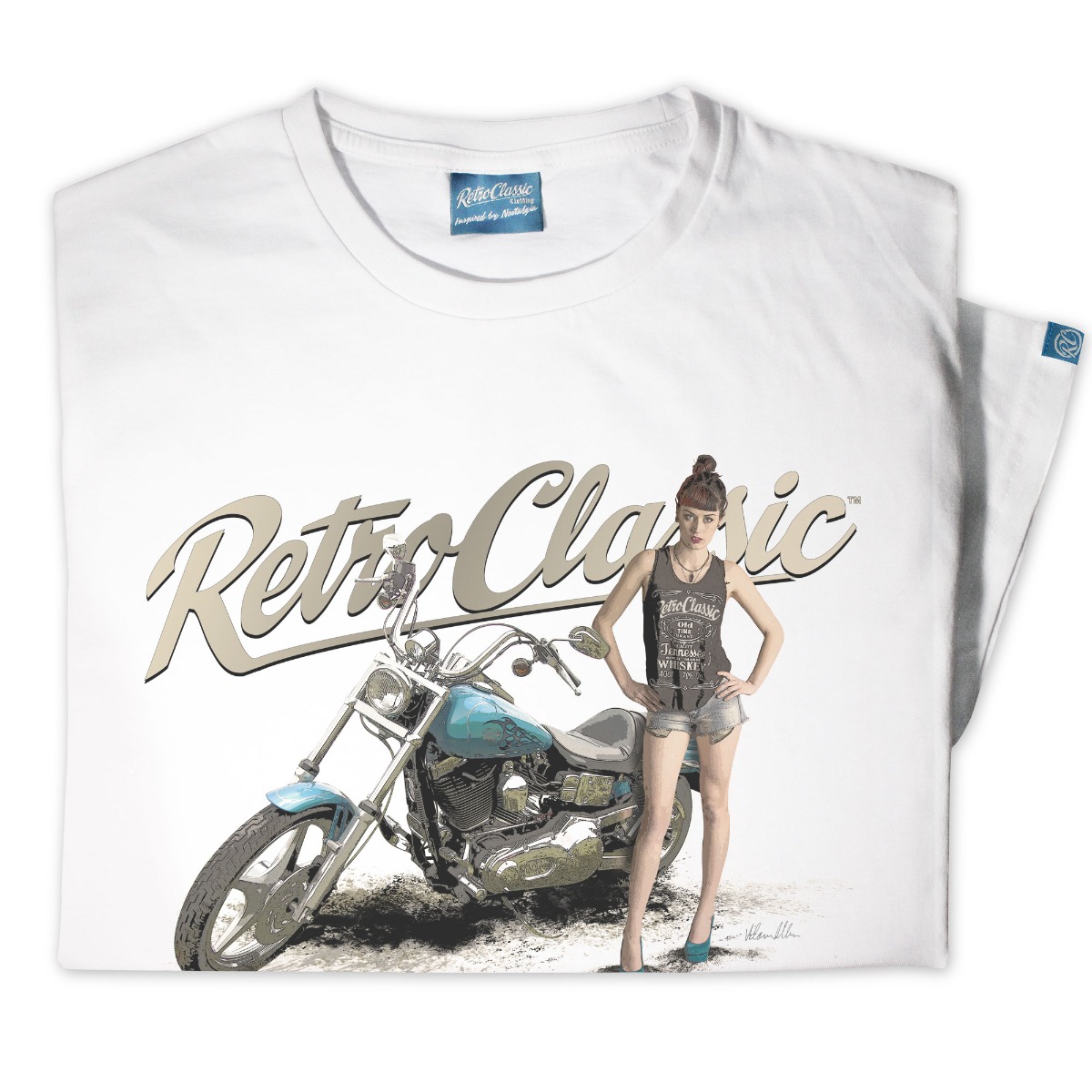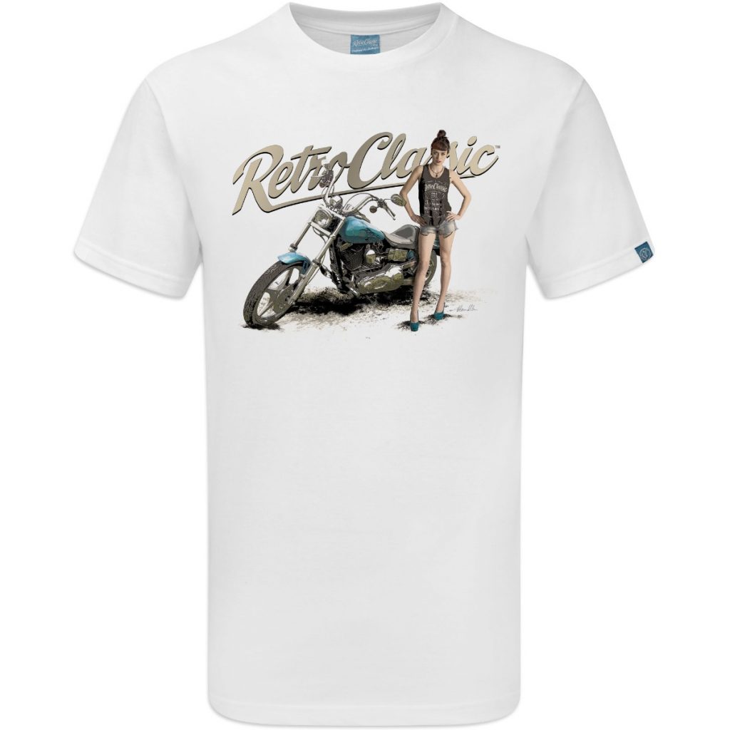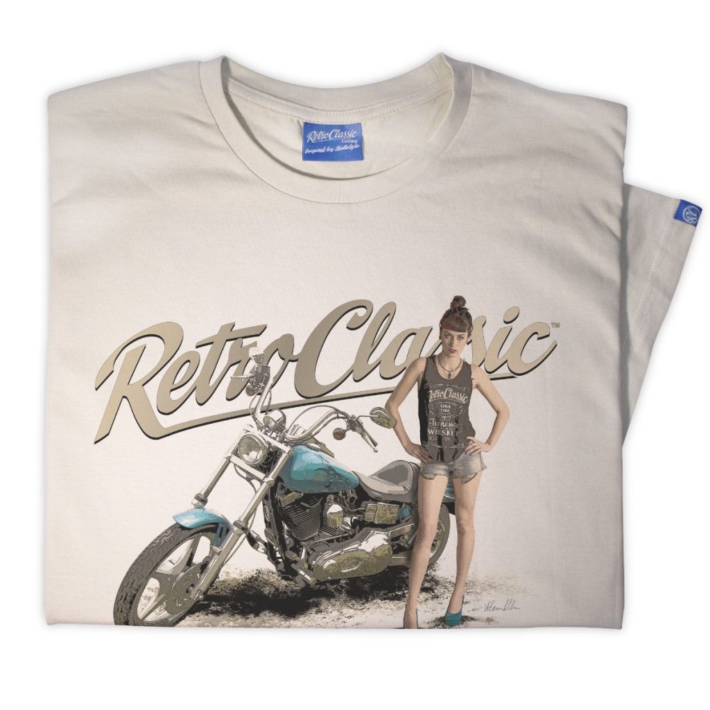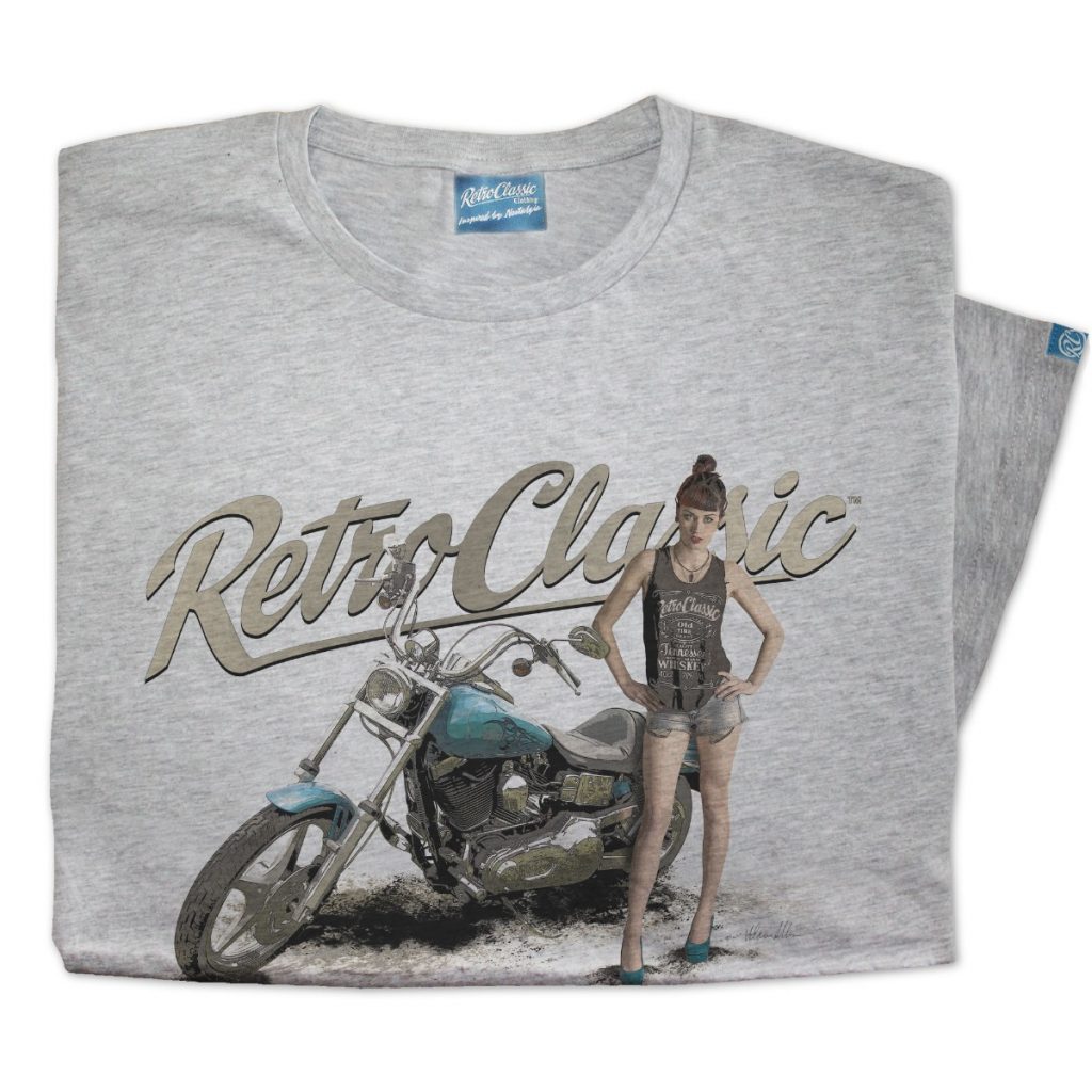 This T-shirt is the very best quality featuring a printed gritty graphic representation of a Classic Harley Davidson inspired Motor Bike and the Alt Fashion Model FreyaaRay.