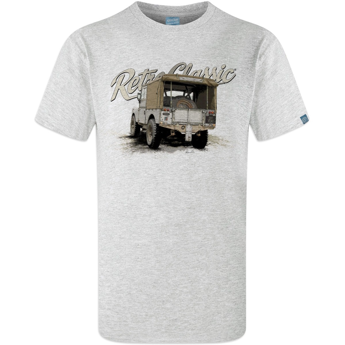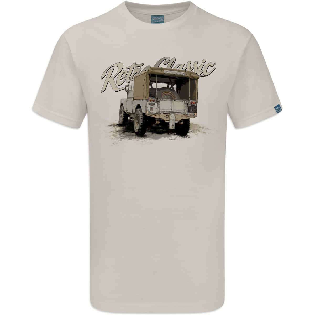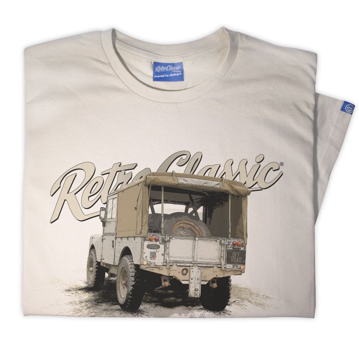 Printed on 100% premium cotton, this tribute to 1948–1958 series one is available in White, Sand, and Heather Grey — designed for off-road enthusiasts, Landy lovers, and classic vehicle collectors.