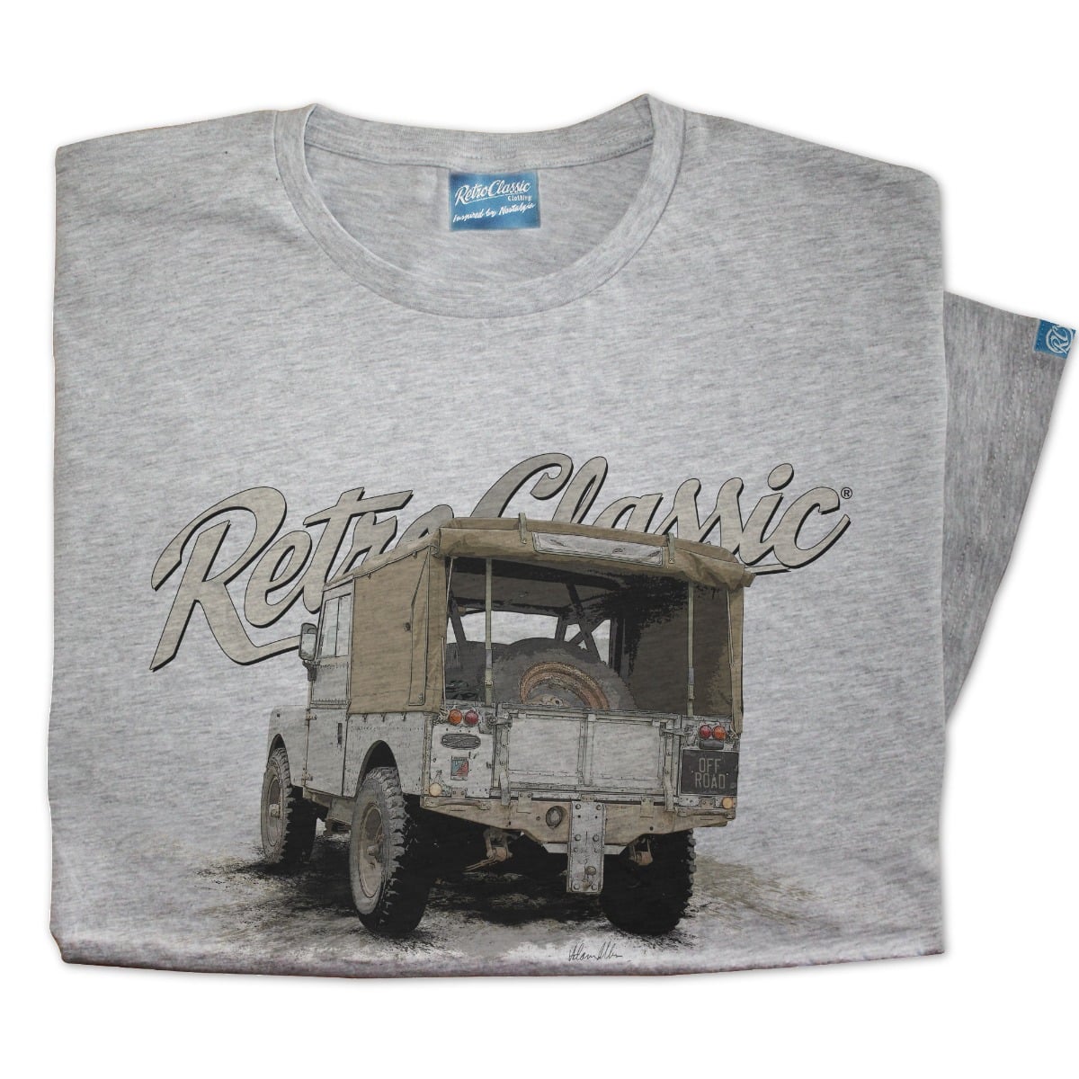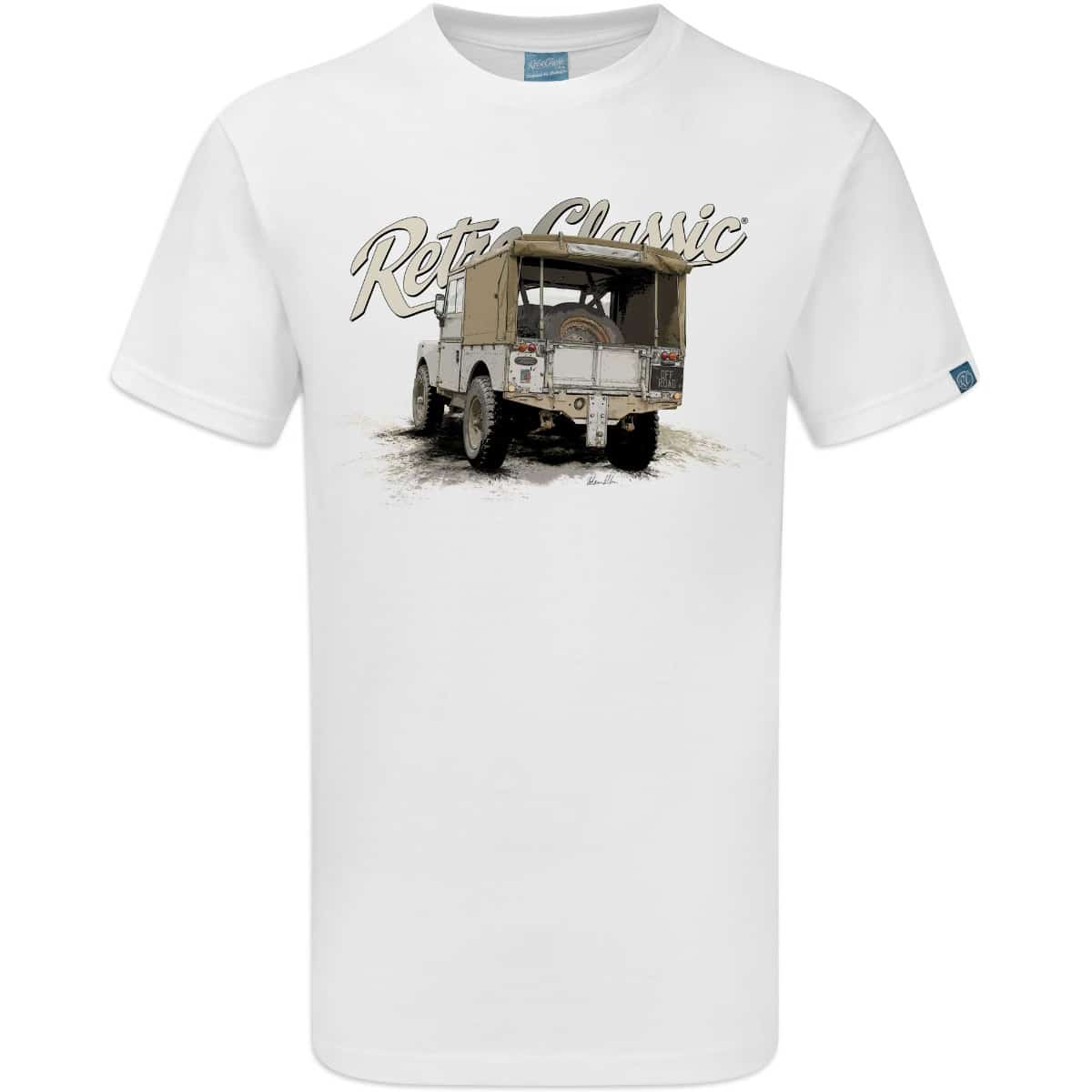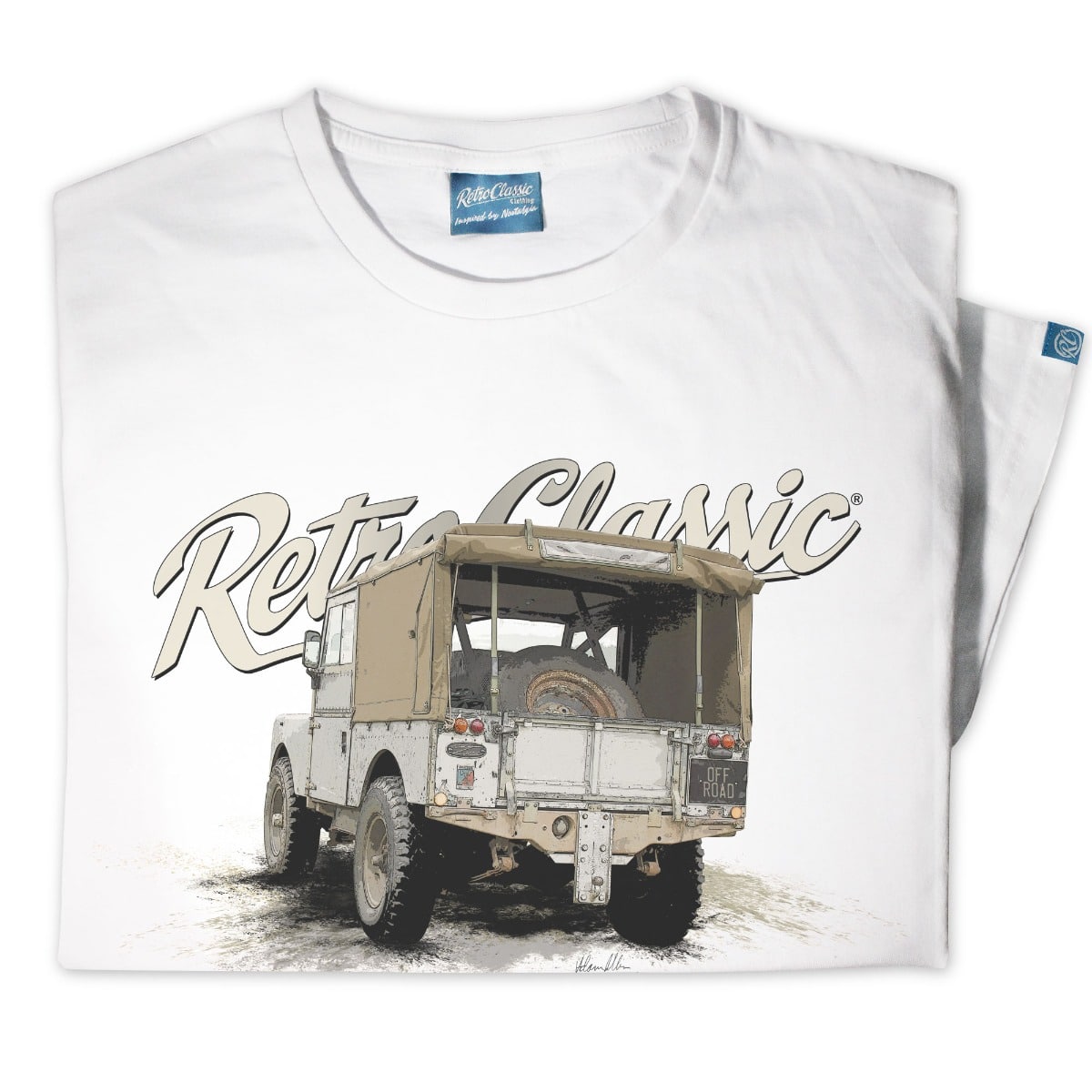 Printed on 100% premium cotton, this tribute to 1948–1958 series one is available in White, Sand, and Heather Grey — designed for off-road enthusiasts, Landy lovers, and classic vehicle collectors.