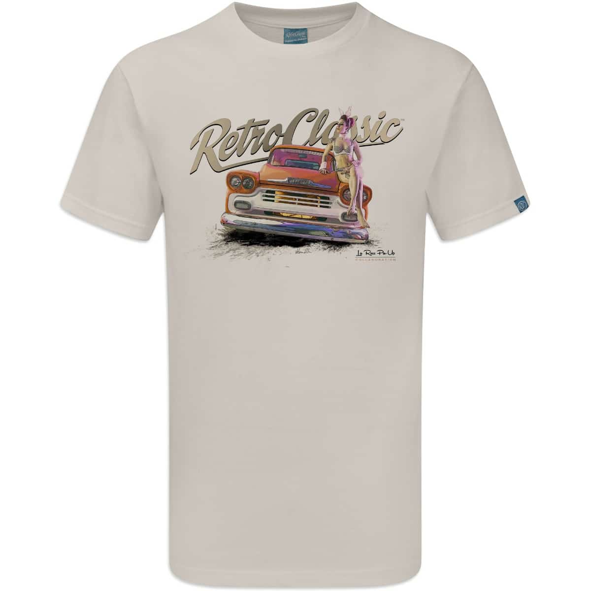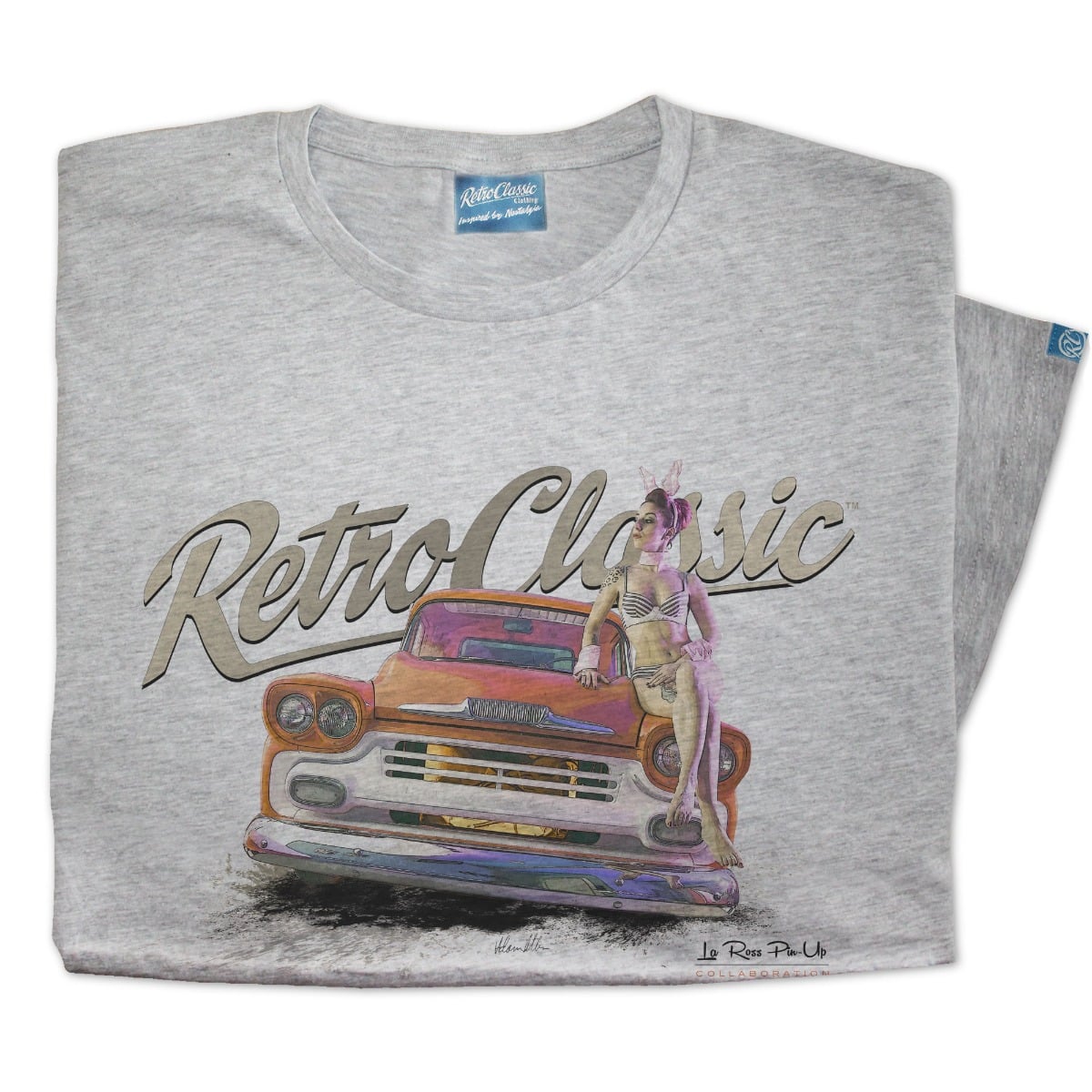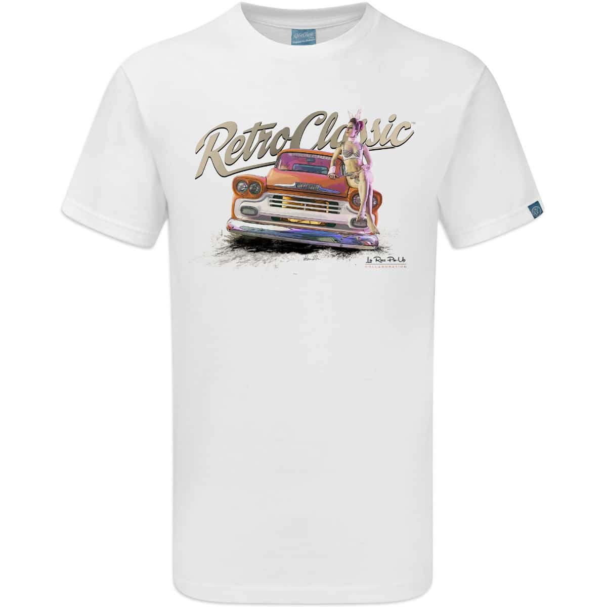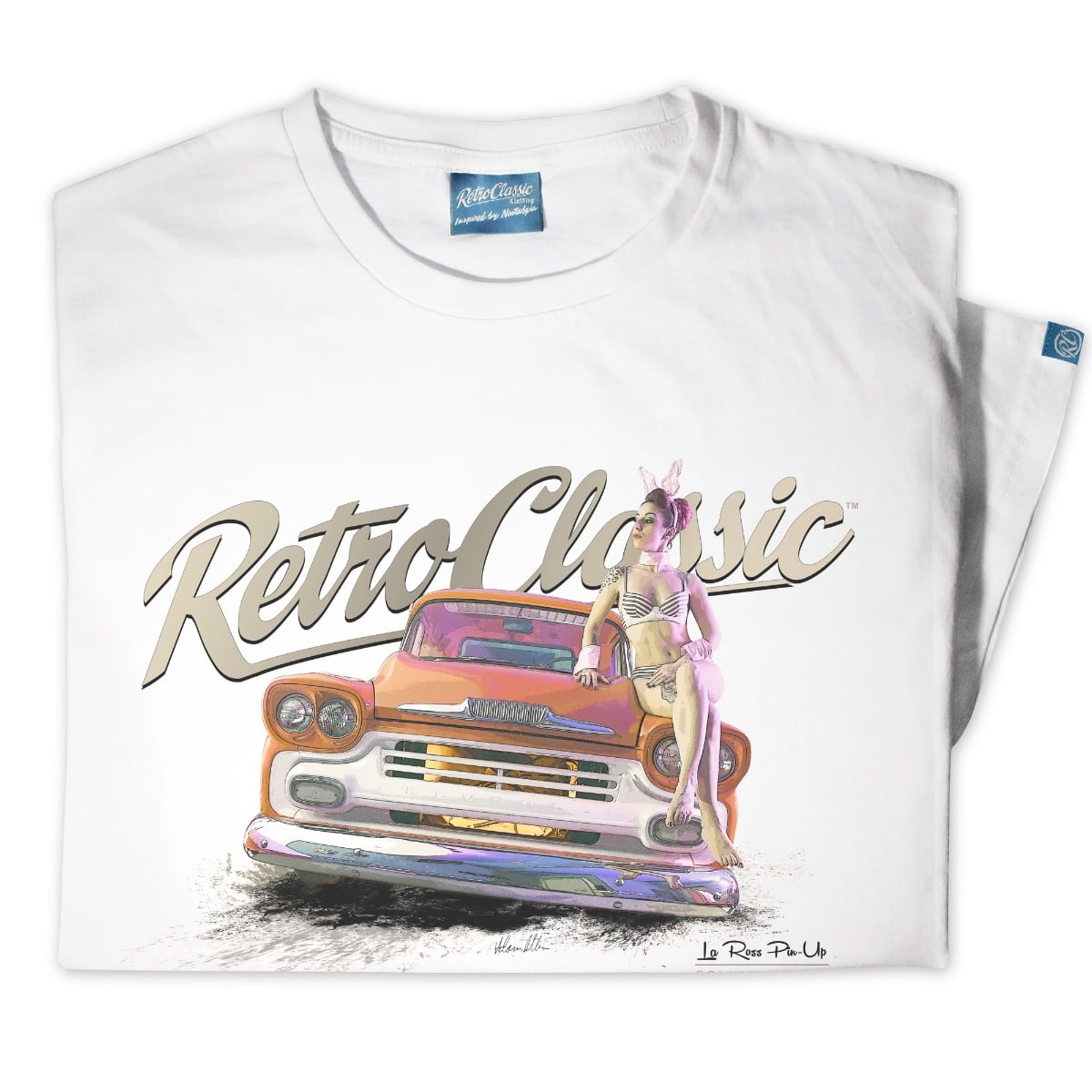 This RetroClassic® exclusive t-shirt features a vibrant pin-up design starring LaRoss, one of Italy’s best-known modern vintage icons, styled in a Playboy-themed outfit beside a beautifully styled Chevy Cameo Carrier-inspired classic pick-up. Shot by renowned photographer Fabio Perotti, the image is a celebration of vintage car culture, mid-century glamour, and retro Americana.