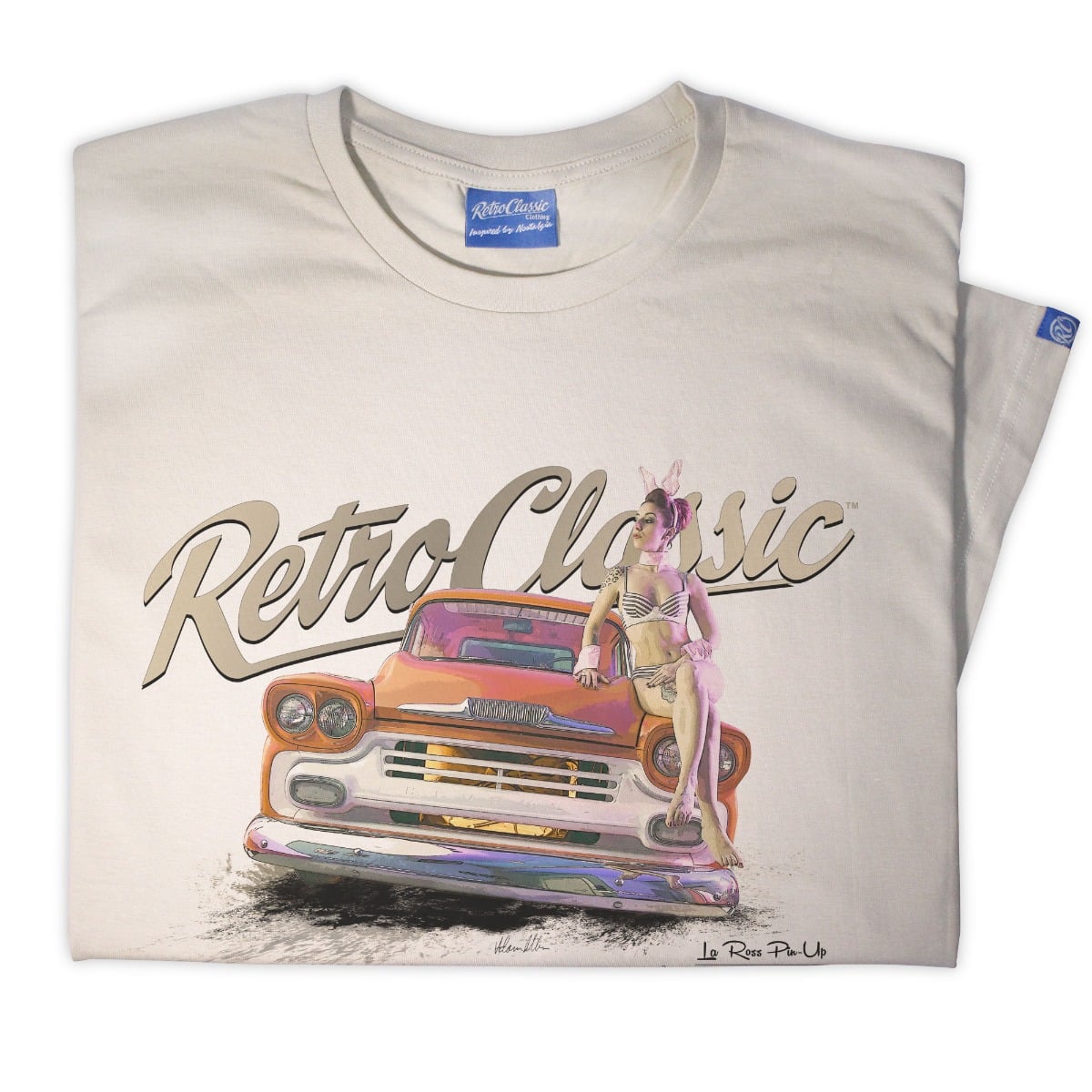 Turn heads with this bold and nostalgic RetroClassic® t-shirt, featuring an exclusive design collaboration with the glamorous Italian pin-up model LaRoss, styled in a Playboy-inspired outfit. Paired with a stunning, retro-styled Chevy Cameo Carrier classic pick-up truck, this artwork captures the perfect blend of vintage Americana, pin-up culture, and classic car heritage.