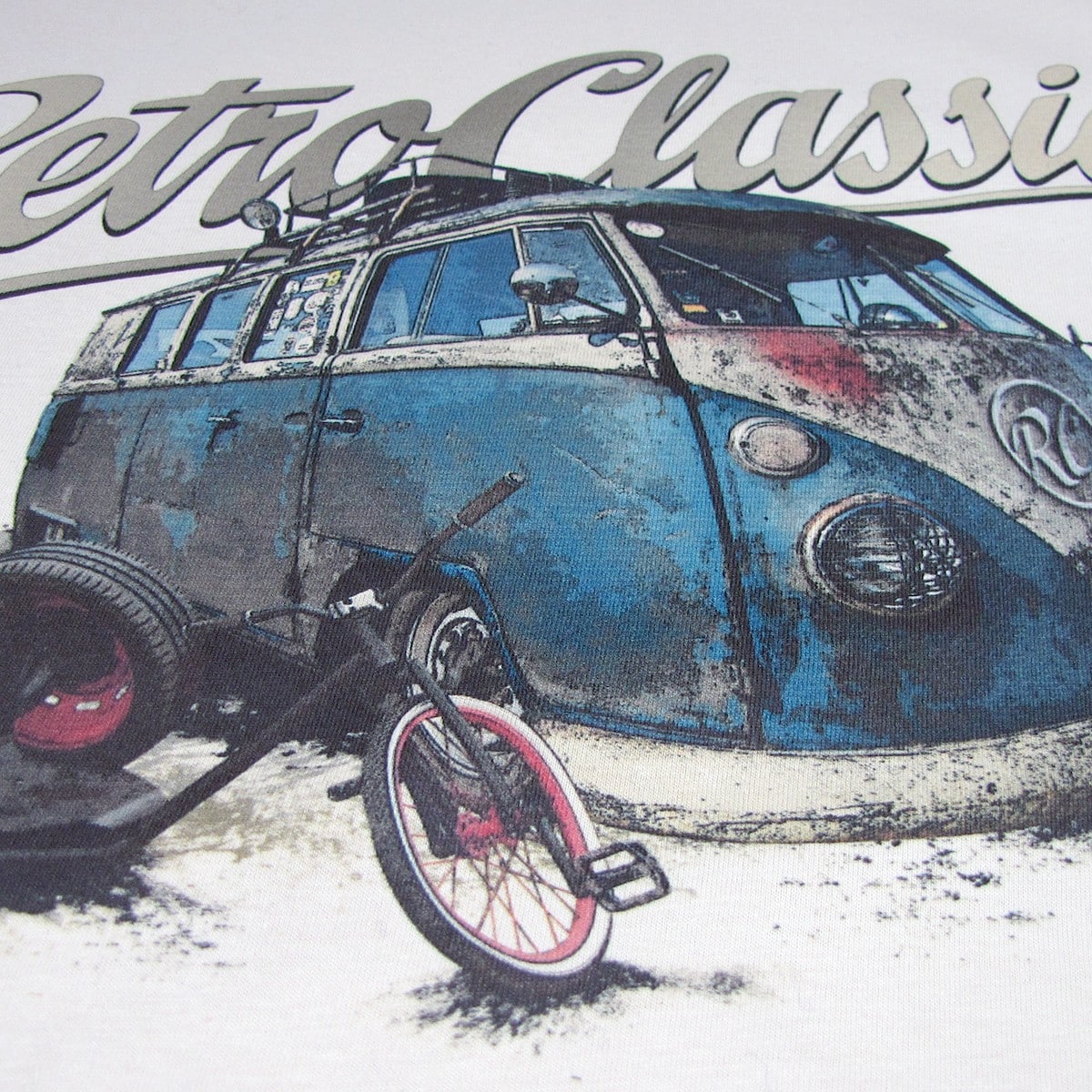 RetroClassicâ„¢ t-shirt featuring Luke’s Rusty Rat Splitty and Drift Trike. Ideal for camper van fans, drift trike enthusiasts, and vintage automotive lovers.