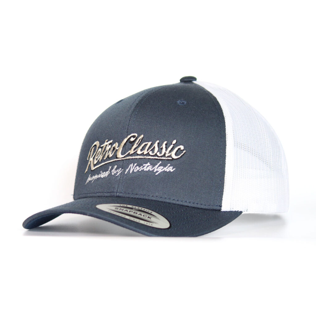 Official RetroClassic trucker cap with embroidered “Inspired by Nostalgia” logo, as worn on Richard Hammond’s Workshop. Retro 2-tone design with breathable mesh and snapback.