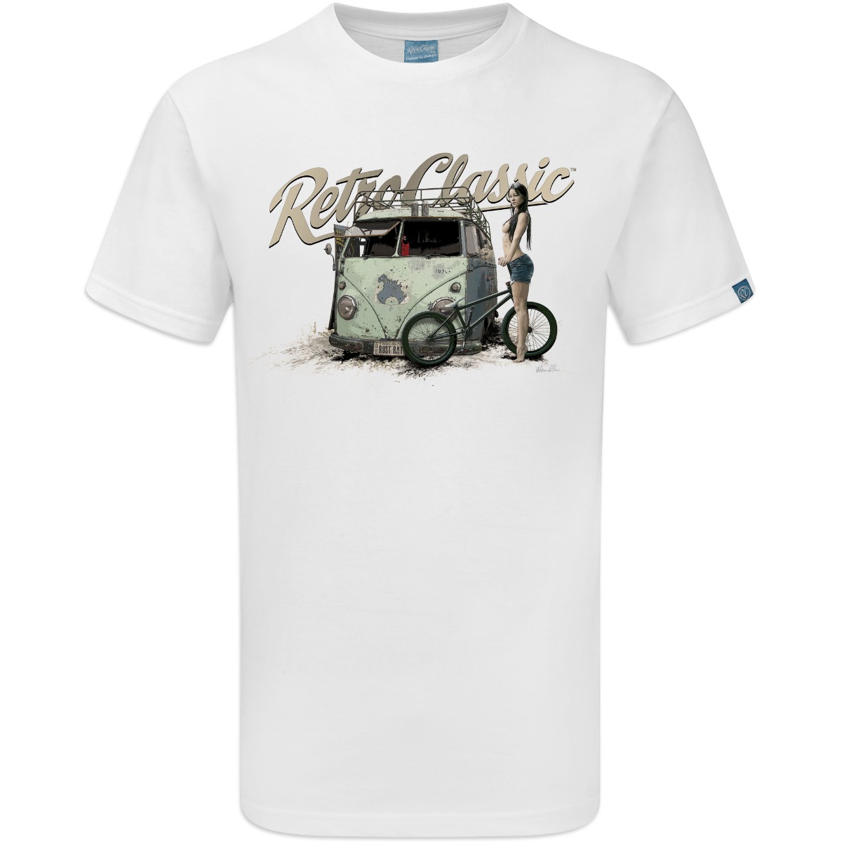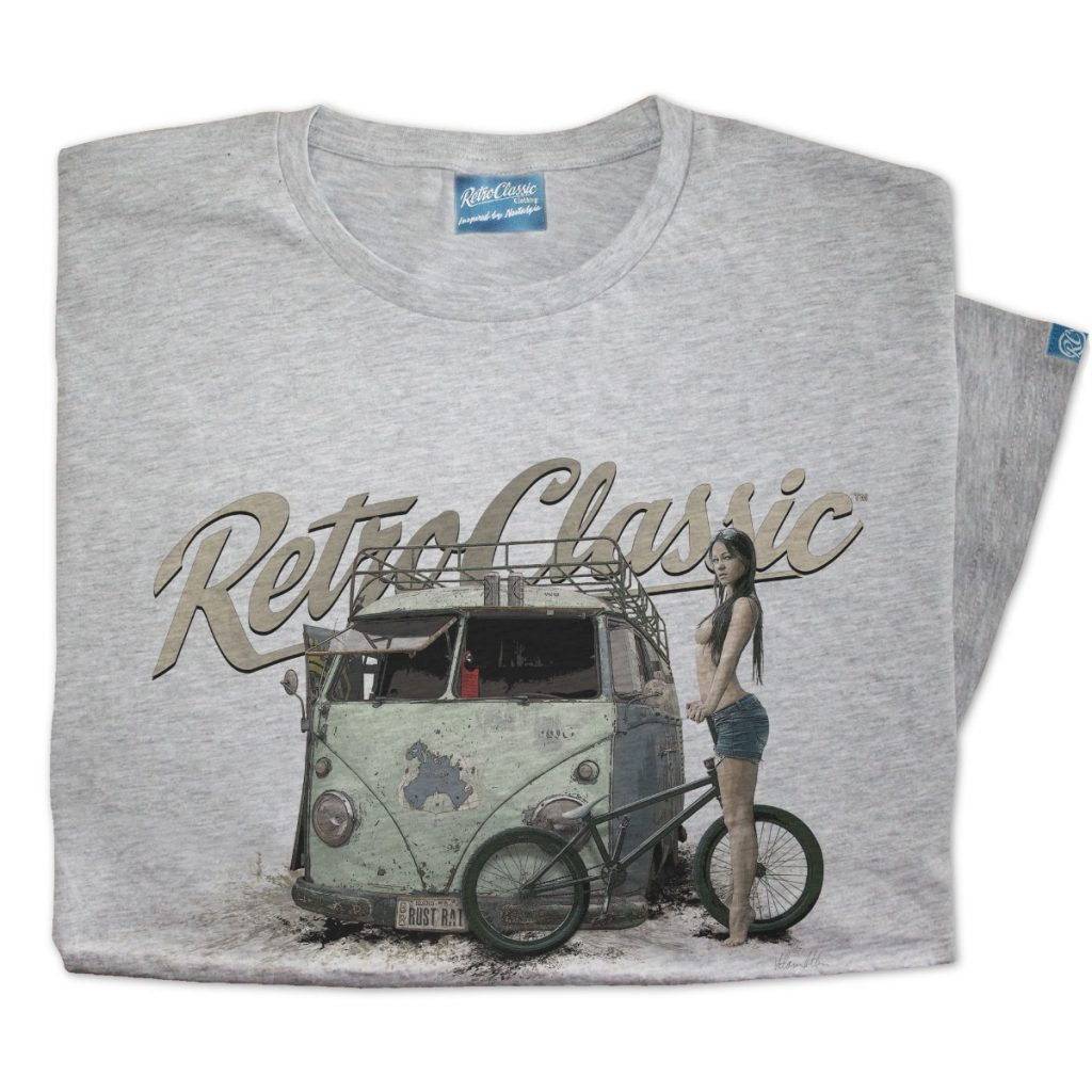 Inject raw retro attitude into your wardrobe with the RetroClassic™ Rusty Rat Camper & BMX T-Shirt. This bold design features a gritty graphic representation of the Hayburner Magazine Retro Rusty Rat Camper Van, paired with model Melisa Mendini riding a BMX, capturing the rebellious spirit of old-school vans, BMX culture, and underground lifestyle scenes.