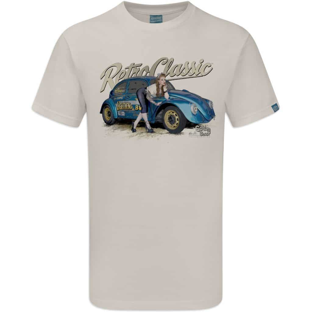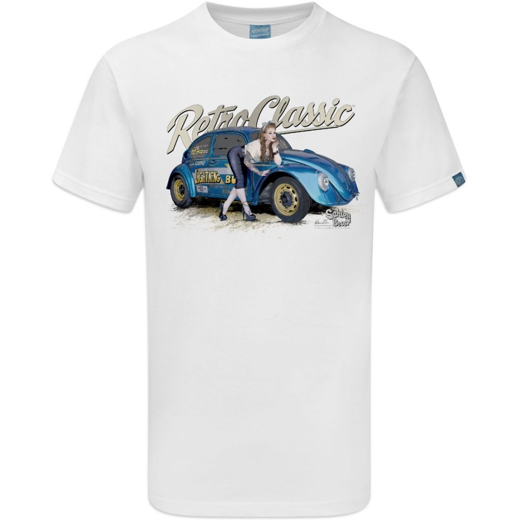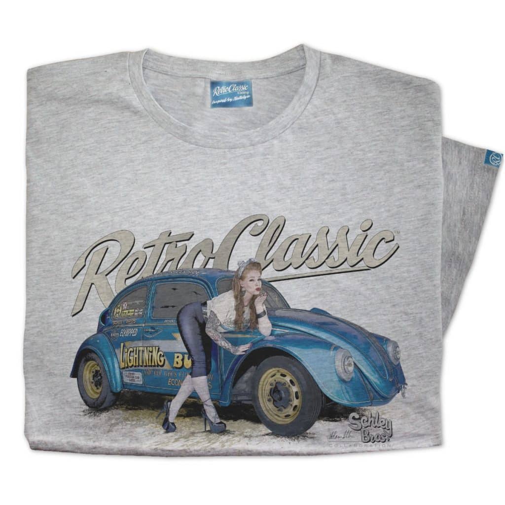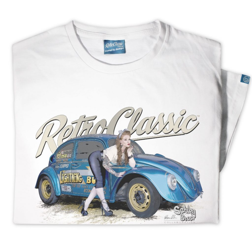 RetroClassic„ are the only ‘Approved’ company by the Schley Bros…to offer ‘Lightning Bug’ Tees. This T-shirt is the very best quality featuring a printed gritty graphic representation of the first Bug in the world to make a 10s 1/4 mile pass and a 8s 1/8 mile pass and international published Pin-up model Autumn Rose. This picture was taken at a photoshoot organised by our good friend Jeff martin at the Schley Bros Museum especially for us at RetroClassic Clothing.