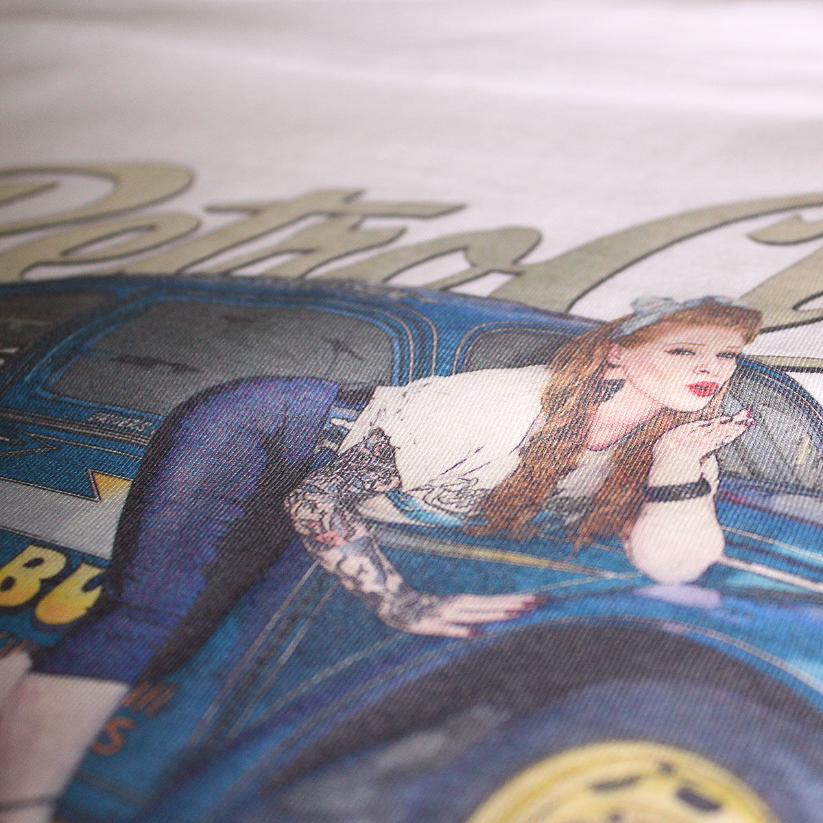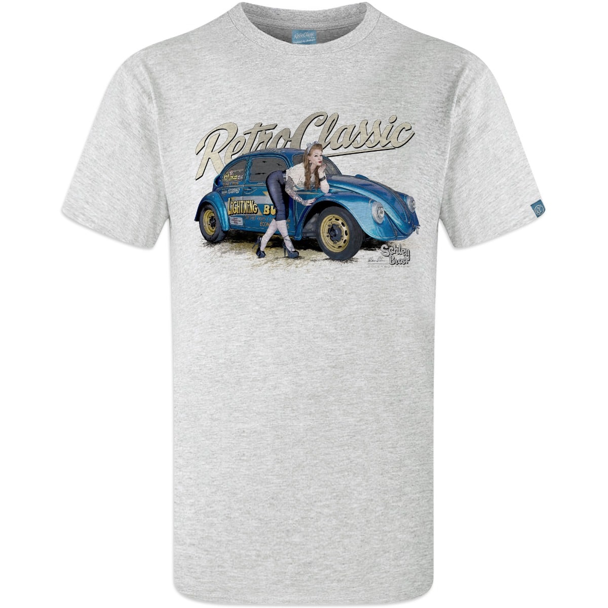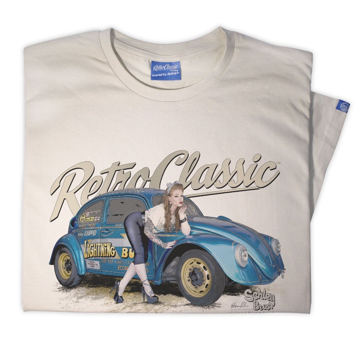 RetroClassic„ are the only ‘Approved’ company by the Schley Bros…to offer ‘Lightning Bug’ Tees. This T-shirt is the very best quality featuring a printed gritty graphic representation of the first Bug in the world to make a 10s 1/4 mile pass and a 8s 1/8 mile pass and international published Pin-up model Autumn Rose. This picture was taken at a photoshoot organised by our good friend Jeff martin at the Schley Bros Museum especially for us at RetroClassic Clothing.