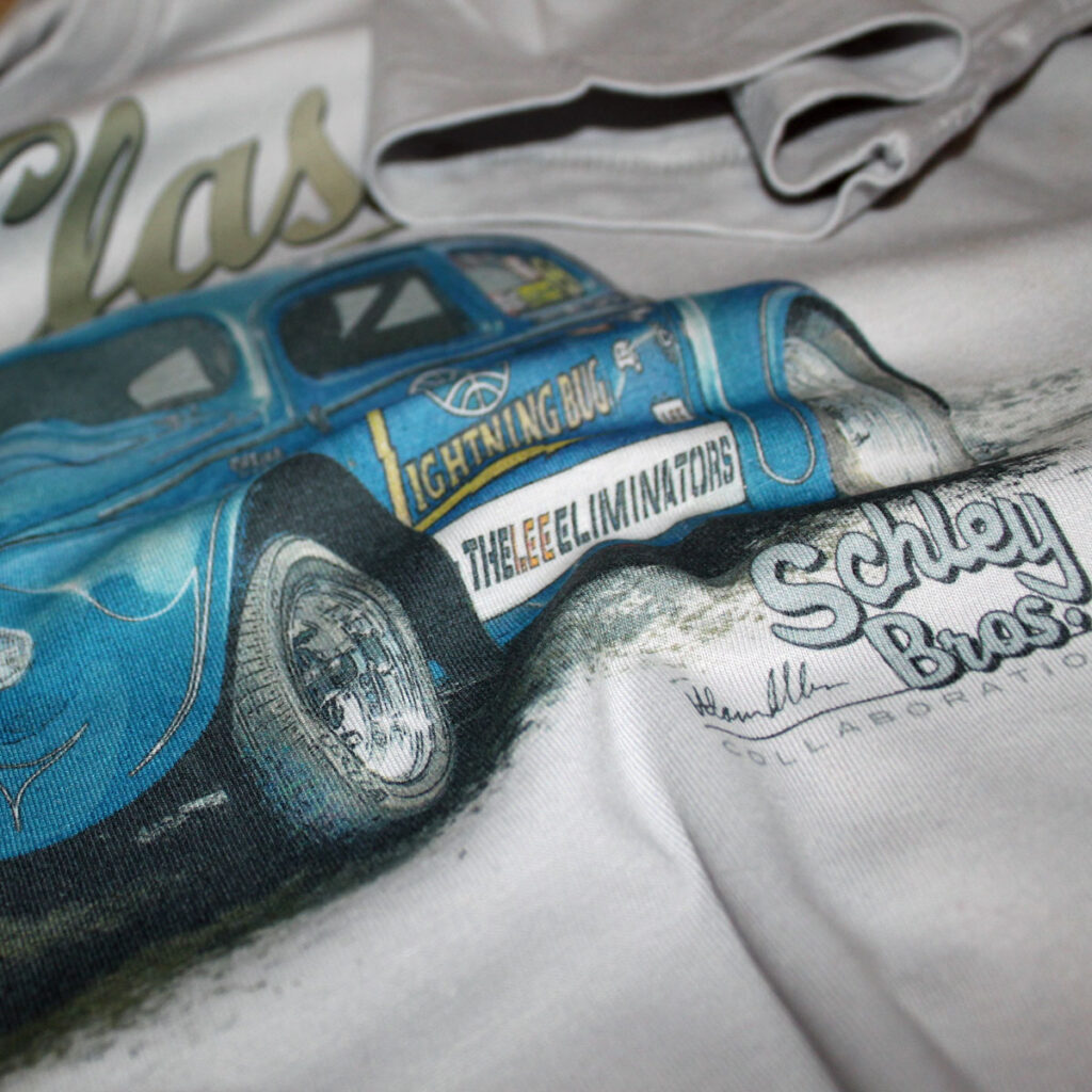 Official RetroClassic Schley Bros Lightning Bug II T-shirt celebrating the first 10-second drag racing legend.