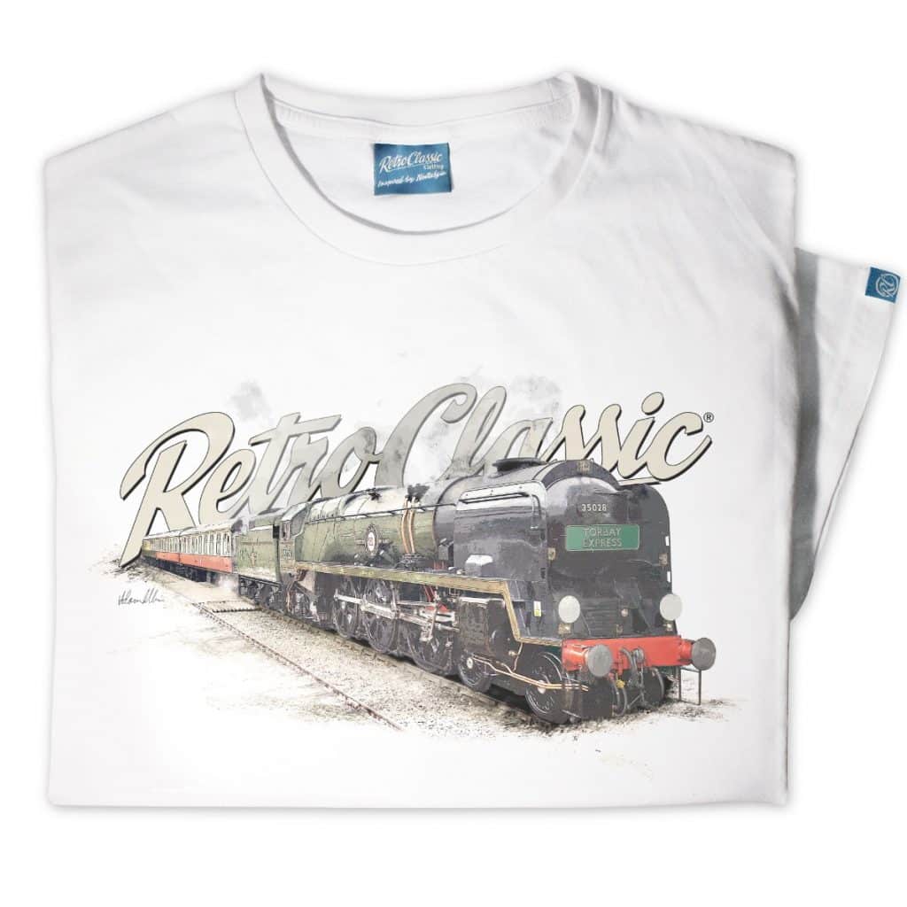 RetroClassic™ Clan Line 35028 steam train t-shirt. Premium cotton tee celebrating British Railways Merchant Navy Class locomotive heritage.