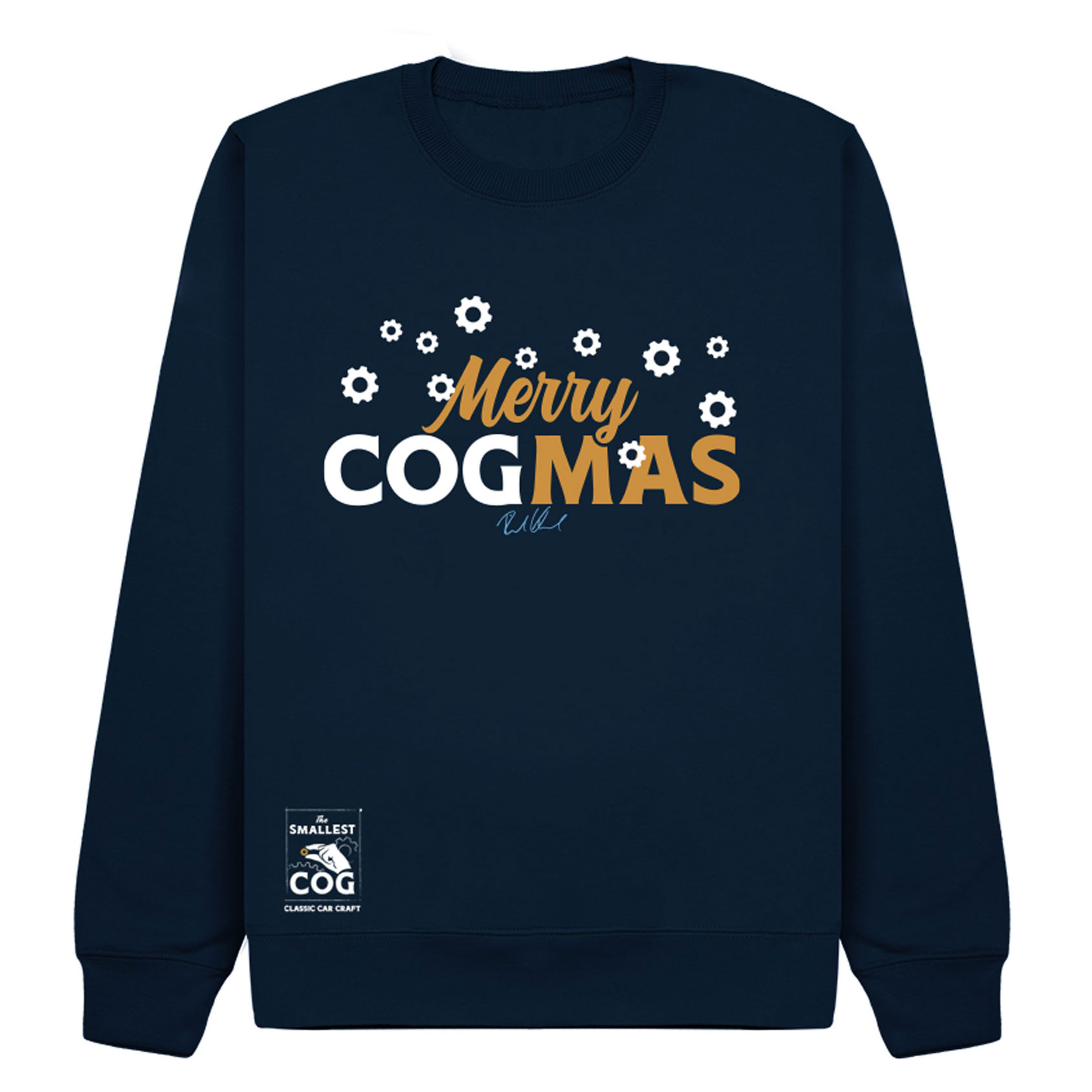 Official The Smallest Cog “Merry Cogmas” Christmas sweatshirt. 280gsm comfort-cut jumper featuring the Smallest Cog logo and festive front print.