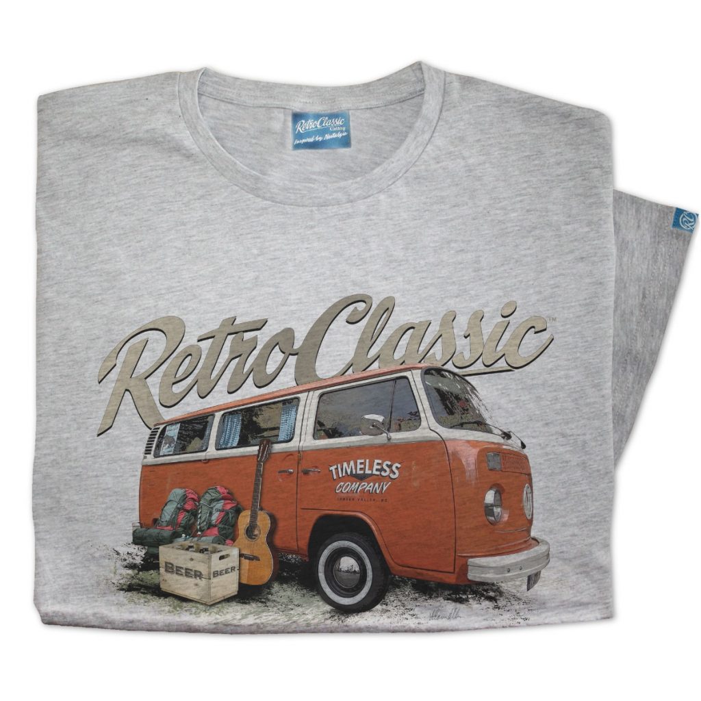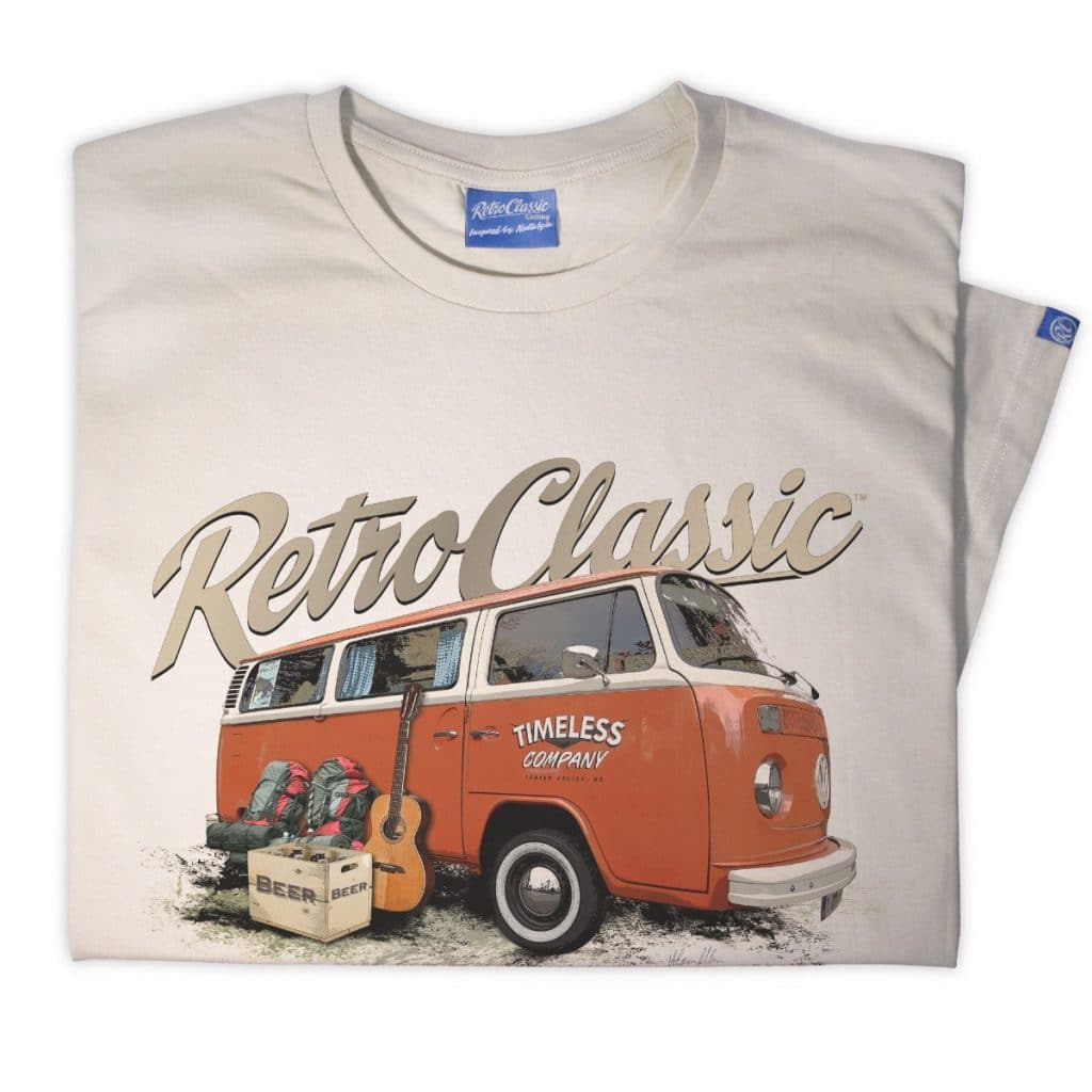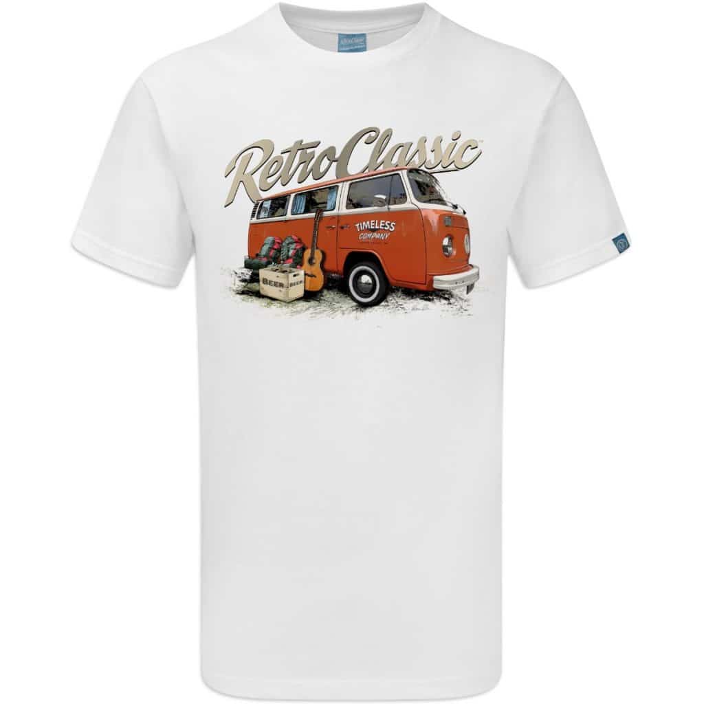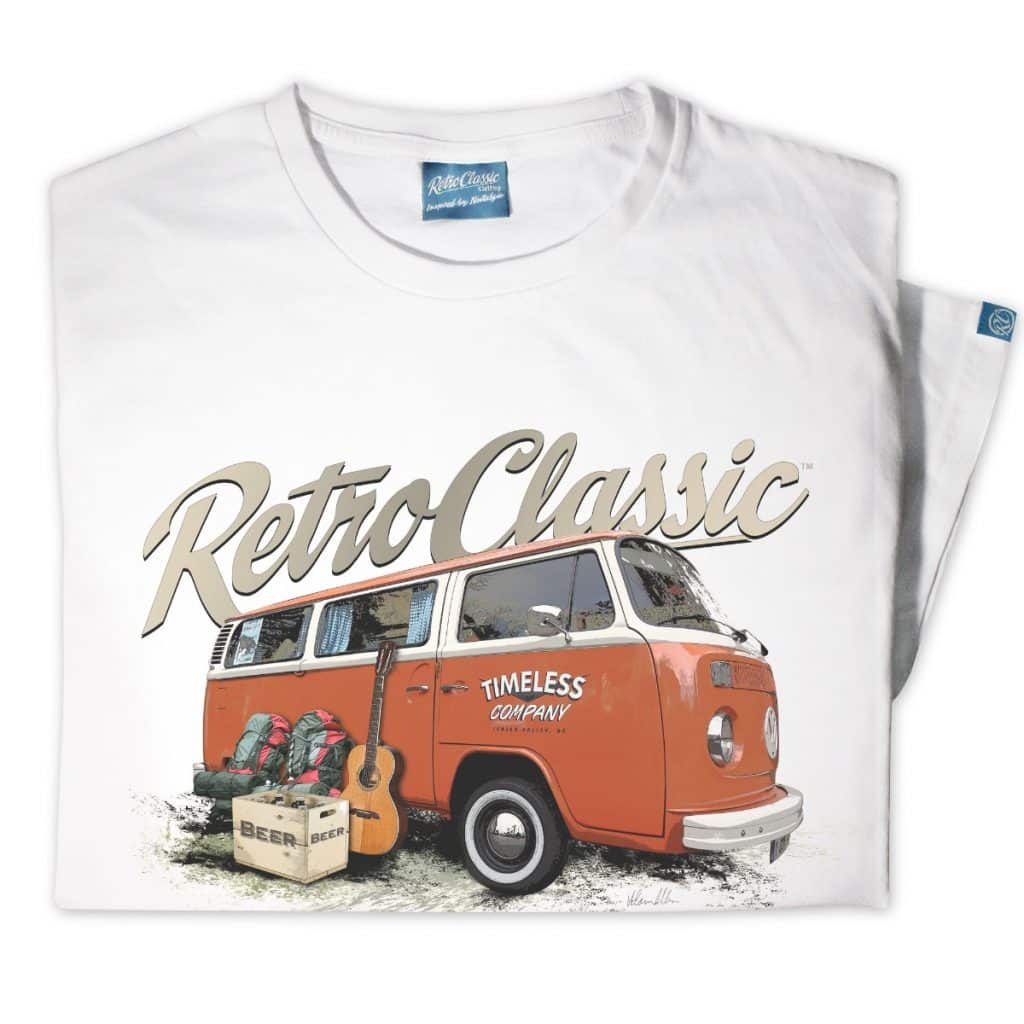 Celebrate classic campervan culture with the RetroClassic™ Timeless Bay Window T-Shirt. This premium mens tee features a printed representation of Mark’s ‘Timeless’ Retro Bay Window Camper and Camping Gear, expertly designed in our RetroClassic style.