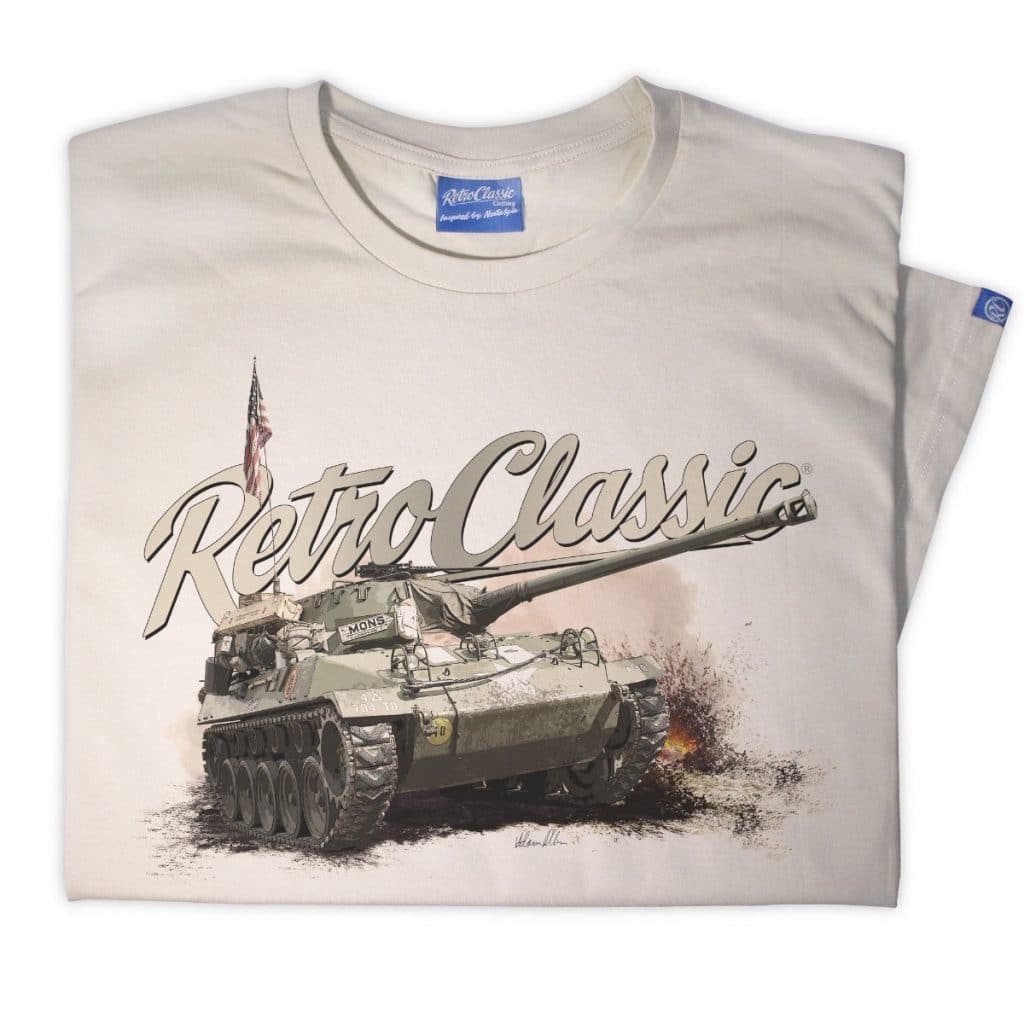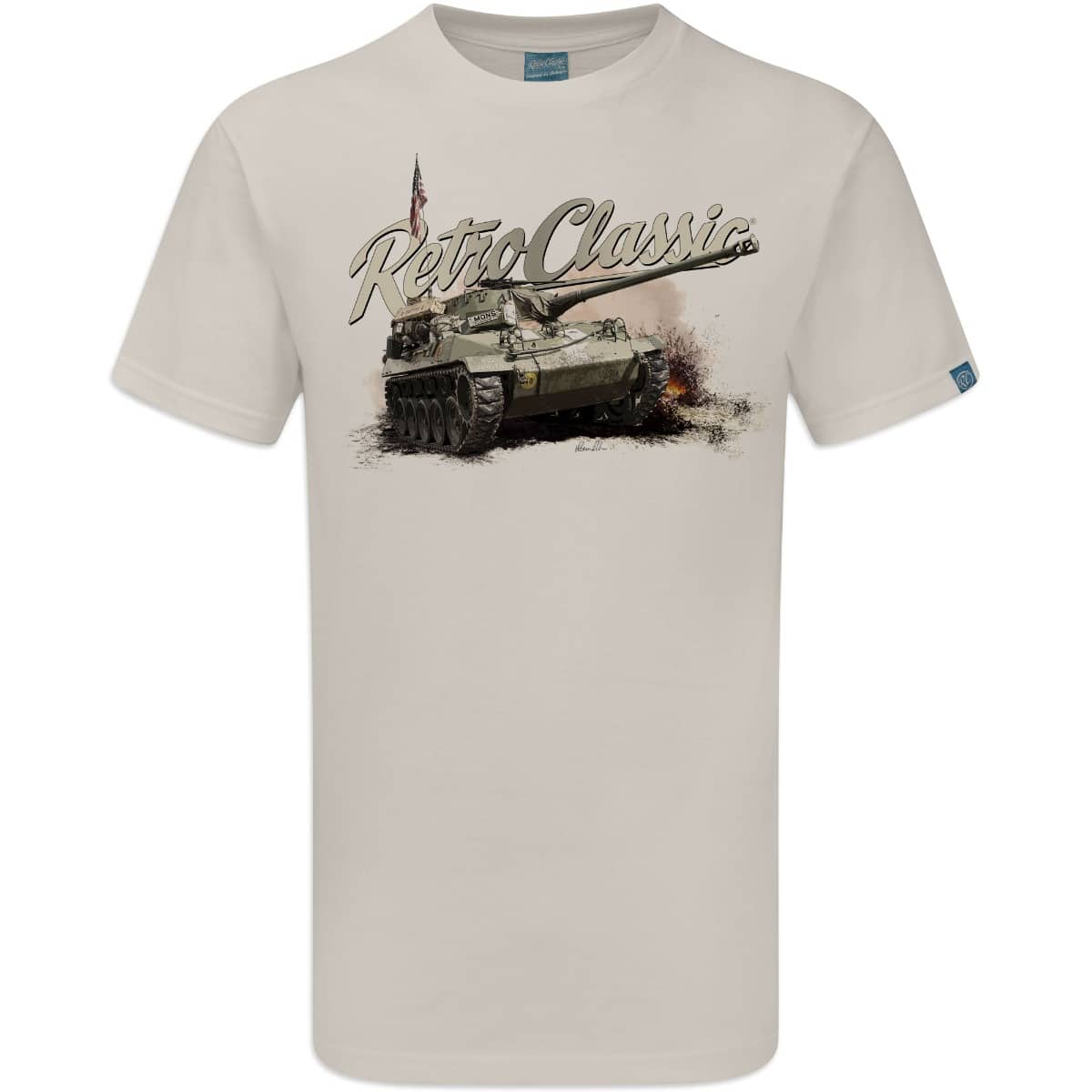 RetroClassicâ„¢ M18 Hellcat t-shirt featuring WWII U.S. tank destroyer. Premium cotton military history tee in White, Sand & Grey.